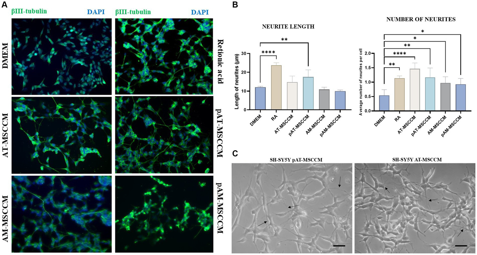 To examine the role of MSCCM in differentiation, we compared the SH-SY5Y cells treated with all-trans retinoic acid (RA) and BDNF, serving as standard differentiation procedure with experimental differentiation processed by incubation SH-SY5Y cells with different MSCCM (AT-MSCCM, AM-MSCCM, pAT-MSCCM, pAM-MSCCM). After RA and MSCCM treatment for 12 days, the cells underwent morphological differentiation, revealing neuron-like characteristics and formation of long neurites (Figure 8A). The neuron-like differentiation was confirmed immunocytochemically by staining with beta-III tubulin, a typical marker for early neurons. Furthermore, the cultivation of SH-SY5Y cells in all conditioned media resulted in the differentiation of SH-SY5Y to neuron-like cells, positive for beta-III tubulin (Figure 8A).