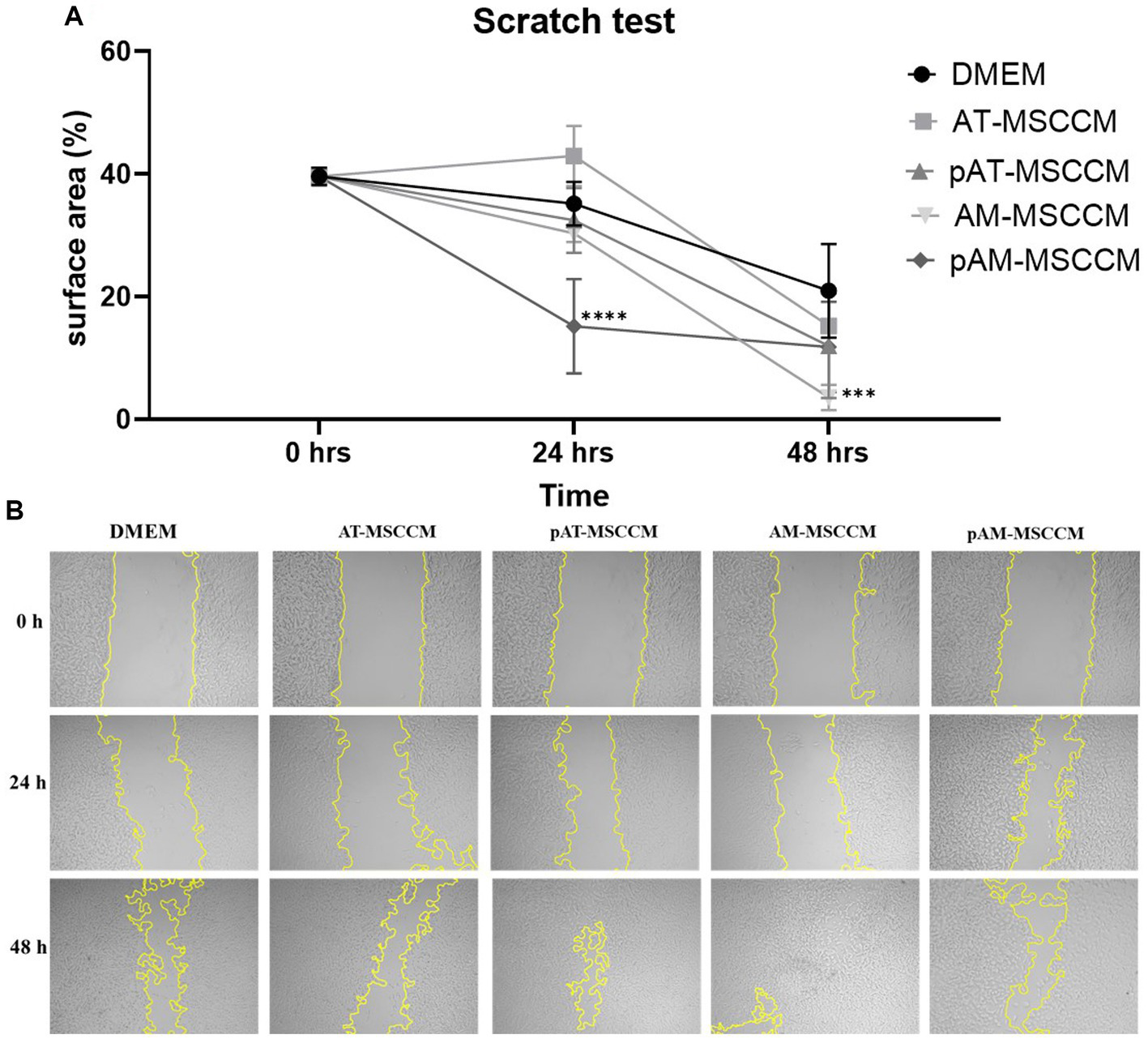 Cell migration detected by the scratch test (magnification, × 5). (A) Shows the statistical analysis of the separation distance of cells in all groups (percentage of empty area per field in all groups) by ANOVA (Dunett’s multiple comparisons tests, ***p < 0.001, ****p < 0.0001). (B) Representative photos of wells where we performed the Scratch test followed by 48-h treatment in Control medium (DMEM with ATB/ATM) and conditioned media (AT-MSCCM, pAT-MSCCM, AM-MSCCM, pAM-MSCCM).