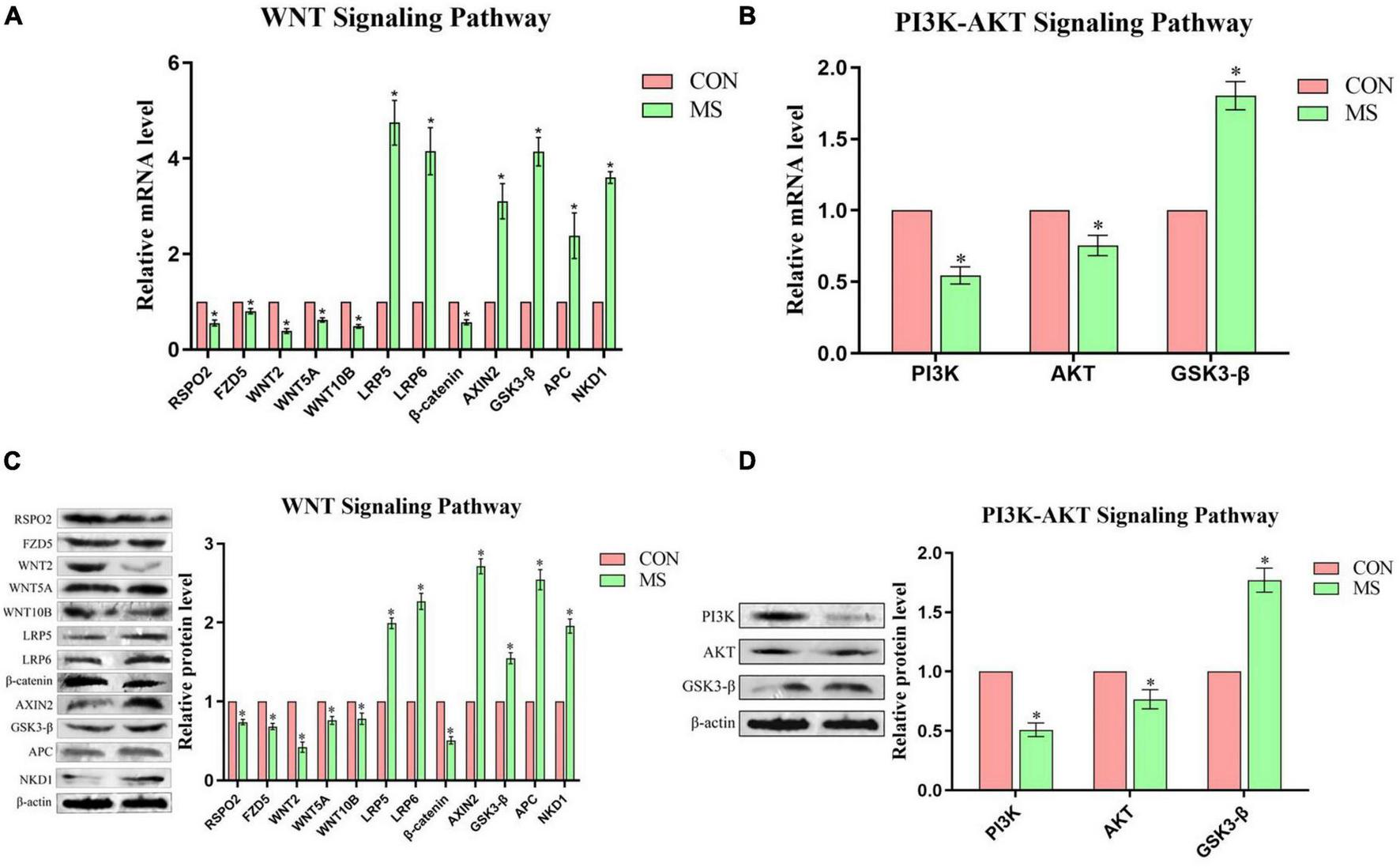 Effect of MS on the expression of genes related to the WNT signaling pathway in the hippocampal and PI3K-AKT signaling pathway in the PFC in piglets (n = 6). (A) Hippocampal WNT signaling pathway mRNA levels. (B) PFC PI3K-AKT signaling pathway mRNA levels. (C) Hippocampal WNT signaling pathway protein expression levels. (D) PFC PI3K-AKT signaling pathway protein expression levels. *P < 0.05.