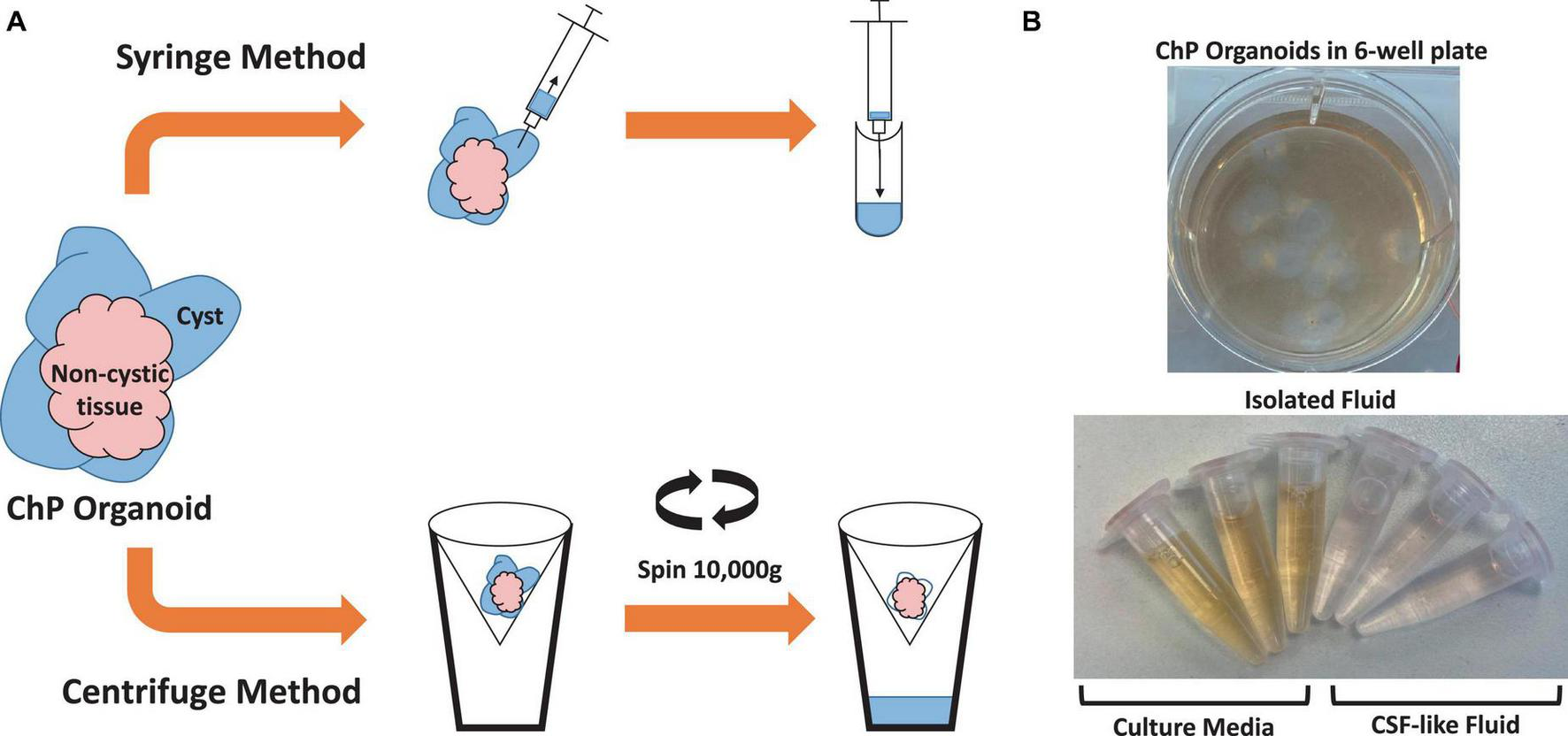 Recently, a method was developed to generate hPSC-derived ChP organoids (Pellegrini et al., 2020). The organoids formed well-defined cystic compartments filled with human CSF-like fluid and were also used to predict the permeability of neuroactive drugs across this ChP barrier. Proteomic analysis of the fluid extracted from ChP organoids revealed remarkable similarity to in vivo derived CSF samples. Interestingly, clinically relevant biomarkers such as APOE, insulin-like growth factor binding protein 7 (IGFBP7), and serpin family F member 1 (SERPINF1) were found in high abundance in fluid derived from ChP organoids (Pellegrini et al., 2020). Here, we will describe the generation of ChP organoids using a commercially available kit, discuss two methods for fluid extraction, and the results of proteomic analysis of the fluid.