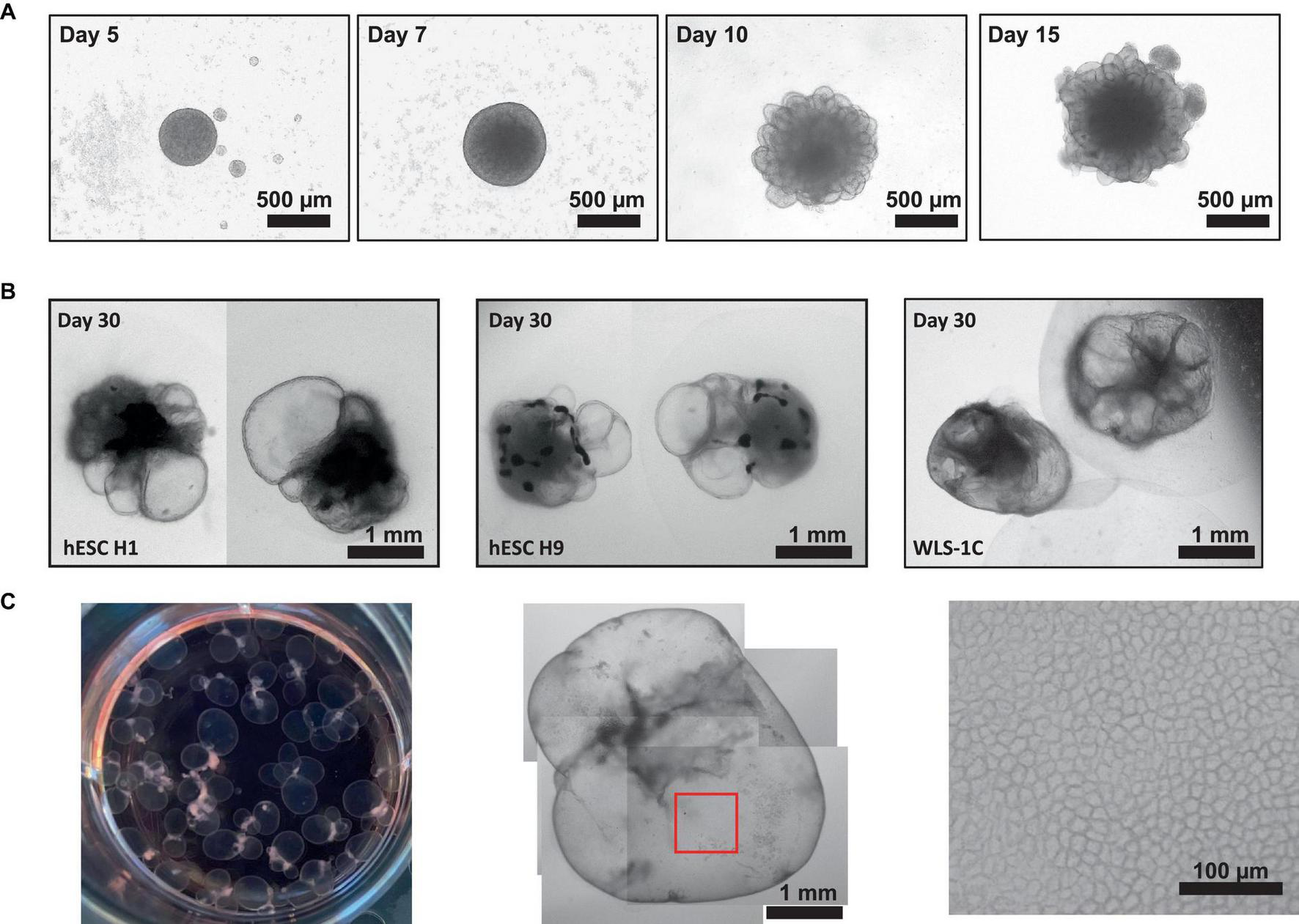 Representative Morphology at Different Stages of ChP Organoid Generation. (A) Representative morphology of ChP organoids after organoid formation (day 5), induction (day 7), expansion (day 10) and ChP differentiation (day 15). (B) Morphology of cystic day 30 H1-, H9-, and 1C-derived ChP organoids. (C) Left: an image of a 6-well plate of day 50 ChP organoids. Middle: representative morphology of a day 50 ChP organoid composed primarily of a fluid-filled cyst. Right; 100X magnification of surface of the cyst (red box shown in middle image) shows tightly packed cells displaying a cuboidal morphology.