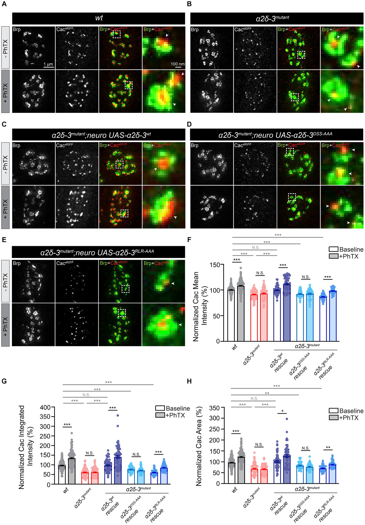 The MIDAS motif is critical for the compensatory increase in presynaptic calcium channel abundance during acute PHP. (A–D) Representative STED images of CacsfGFP (green) and Bruchpilot (Brp, red) at the NMJ in wild-type (wt, CacsfGFP, A), α2δ-3 homozygous mutant (α2δ-3mutant, CacsfGFP;α2δ-3k10814/α2δ-3106, B), motoneuron overexpression of α2δ-3wt (α2δ-3wt rescue, CacsfGFP;OK371-Gal4,α2δ-3k10814/α2δ-3106;UAS-α2δ-3wt, C), motoneuron overexpression of α2δ-3DSS-AAA (α2δ-3DSS-AAA rescue, CacsfGFP;OK371-Gal4,α2δ-3k10814/α2δ-3106;UAS-α2δ-3DSS-AAA, D), and motoneuron overexpression of α2δ-3RLR-AAA (α2δ-3RLR-AAA rescue, CacsfGFP;OK371-Gal4,α2δ-3k10814/α2δ-3106;UAS-α2δ-3RLR-AAA, E) in the α2δ-3 homozygous mutant background in the absence (-PhTX, upper panels) and presence of PhTX (+PhTX, lower panels). Representative images of individual active zones (indicated by white boxes) are shown at higher magnification in panels on the far right. Presynaptic calcium channels localized to active zones are indicated by arrowheads. (F–H) Normalized average mean intensity (F), integrated intensity (G) and area of CacsfGFP(H) inside each active zone (indicated by Brp) in wild-type (wt, CacsfGFP, n = 157 −PhTX, n = 160 +PhTX), α2δ-3 homozygous mutant (α2δ-3mutant, CacsfGFP;α2δ-3k10814/α2δ-3106, n = 118 −PhTX, n = 104 +PhTX), motoneuron overexpression of α2δ-3wt (α2δ-3wt rescue, CacsfGFP;OK371-Gal4,α2δ-3k10814/α2δ-3106;UAS-α2δ-3wt, n = 59 −PhTX, n = 59 +PhTX), motoneuron overexpression of α2δ-3DSS-AAA (α2δ-3DSS-AAA rescue, CacsfGFP;OK371-Gal4,α2δ-3k10814/α2δ-3106;UAS-α2δ-3DSS-AAA, n = 47 −PhTX, n = 47 +PhTX), and motoneuron overexpression of α2δ-3RLR-AAA (α2δ-3RLR-AAA rescue, CacsfGFP;OK371-Gal4,α2δ-3k10814/α2δ-3106;UAS-α2δ-3RLR-AAA, n = 45 −PhTX, n = 45 +PhTX) in the α2δ-3 homozygous mutant background in the absence (−PhTX, upper panels) and presence of PhTX (+PhTX, lower panels). All values in the mutant and rescue groups are normalized to wild-type and percentage changes are shown. Mean ± SEM; *q < 0.05, **q < 0.01, ***q < 0.001, N.S. not significant; nonparametric Kruskal-Wallis test with Benjamini and Hochberg FDR method was used to correct for multiple comparisons.