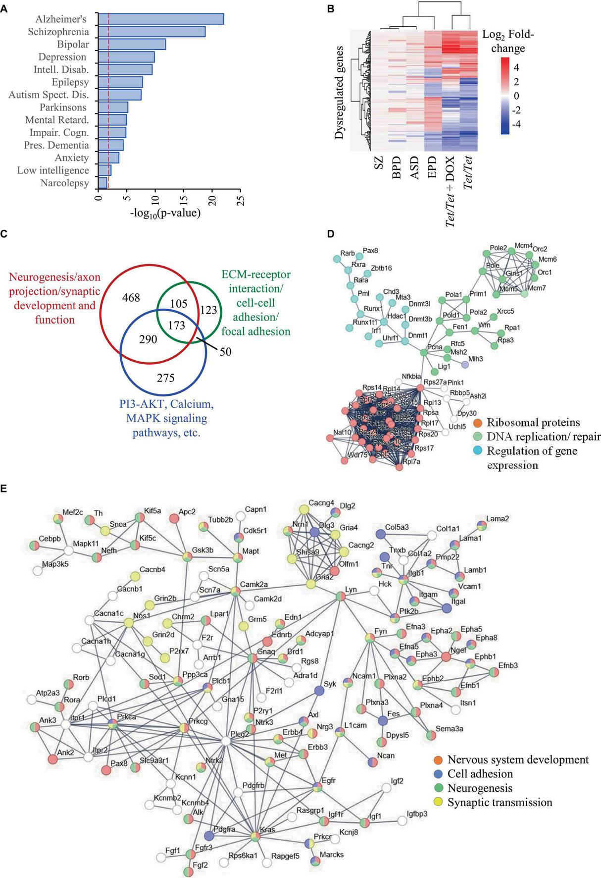 Dysregulation of genes due to DNMT1 overexpression and their relationship with SZ, BPD, EPD and ASD. (A) Disease ontology terms identified in 3,211 genes subjected to transcript level dysregulation in untreated Tet/Tet neurons from the list of 6,231 genes identified in Figure 1F. (B) Hierarchical clustering of the 296 genes and their corresponding log2 fold-changes among in the four neurodevelopmental disorders, untreated and doxycycline-treated Tet/Tet neurons. (C) Overview of the three main sets of pathways involving a majority of the 3,211 genes. (D,E) STRING analysis of genes involved in some main biological processes identified among the 3,211 genes.