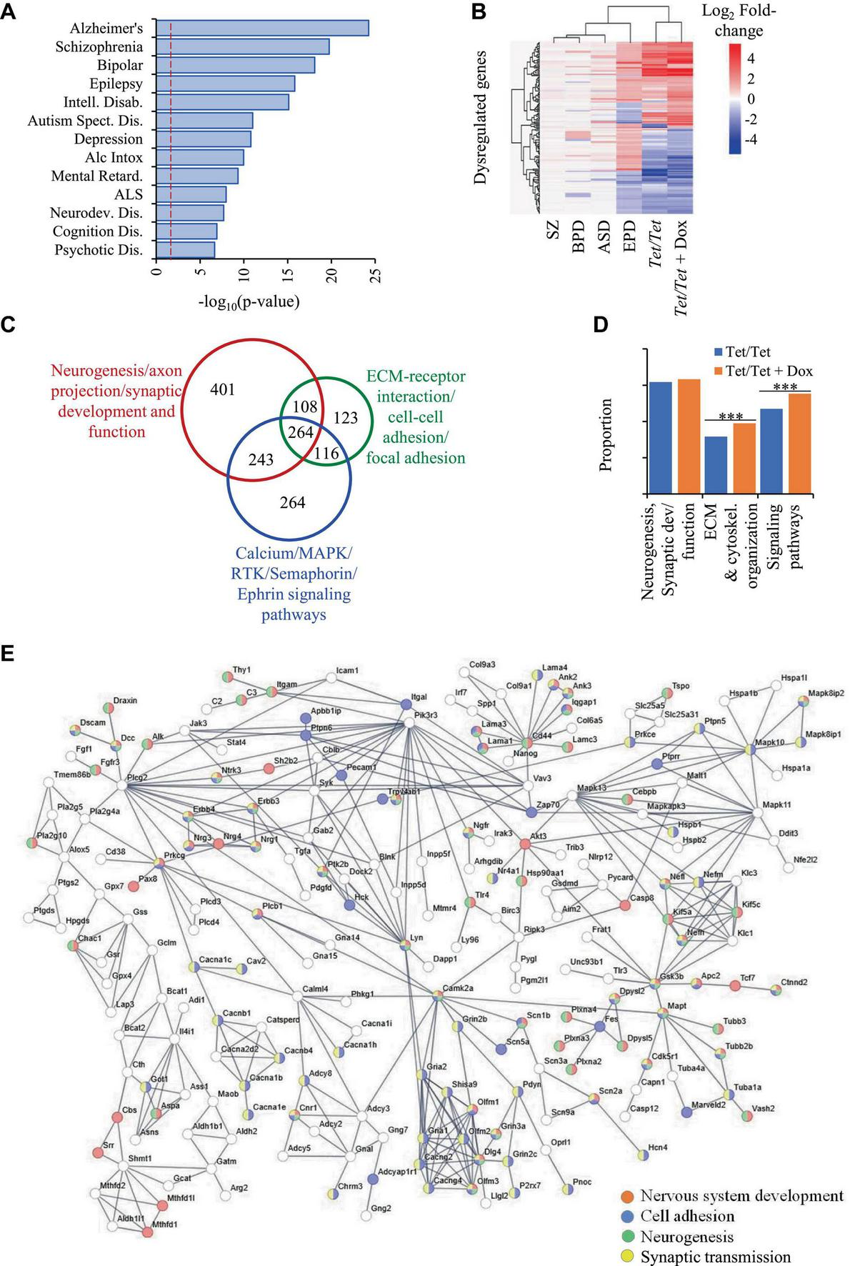 We selected ASD, BPD, SZ and EPD as a group of four common neurodevelopmental disorders and obtained information on genes subjected to transcript level dysregulation from publicly available databases. This search yielded 19,670 dysregulated genes of which 8,809 were shared between any two disorders, leaving 10,861 unique set for comparisons with untreated and doxycycline-treated Tet/Tet neurons (Figure 1E). Of the 6,231 q-significant transcripts observed in untreated Tet/Tet neurons, 3,211 genes showed significantly altered transcripts (Figure 1F and Supplementary Table 2). Within the four disorders, enrichment was observed for SZ with highest significance, followed by BPD, EPD and ASD (Figure 2A and Supplementary Table 3). We also observed a significant enrichment for other neurological/behavioral and neurodegenerative phenotypes, with Alzheimer’s showing the most significant enrichment among all disorders. A comparison of the log2-fold values of the dysregulated genes among the four neurodevelopmental disorders, untreated and doxycycline-treated Tet/Tet neurons is shown in Figure 2B. The dysregulation patterns in the treated as well as untreated Tet/Tet neurons were more similar to those in EPD. Bioinformatic analysis of the genes dysregulated in the untreated Tet/Tet neurons showed significant enrichment of pathways implicated in neurodevelopment, axon guidance, excitatory as well as inhibitory synapses, etc (Figure 2C and Supplementary Table 4). Similar mutually agreeing results were obtained using gene ontology terms (Supplementary Table 5) and protein-protein interaction analyses (Figures 2D, E).
