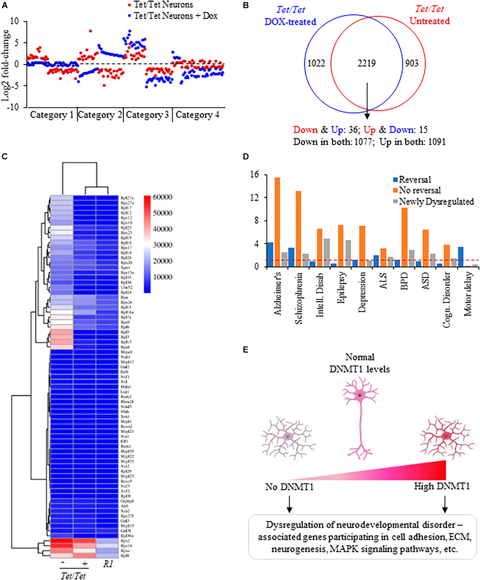 Analysis of dysregulated genes due to DNMT1 overexpression and its loss. (A) Representative log2 fold transcript level changes of genes in untreated and DOX-treated Tet/Tet neurons. Blue: transcript levels after DOX-treatment; Red: transcript levels in untreated cells. (B) Comparison of genes subject to transcript level dysregulation between untreated and dox-treated Tet/Tet neurons. Top: Venn diagram with genes specifically dysregulated in cell types indicated. Bottom: number of genes with altered transcript levels in both untreated and doxycycline treated Tet/Tet neurons. Down and Down: decreased transcript levels in both untreated and dox-treated cells, Up and Up: increased transcript levels in both cell types, Down and Up: decreased transcript levels in untreated cells but with increased levels in dox-treated cells, Up and Down: increased transcript levels in untreated cells but with decreased levels in dox-treated cells. (C) Heatmap of the 73 genes involved in the ribosome biogenesis/assembly/translation pathways implicated in the four disorders of interest. Whereas 51 genes showed significantly altered levels in untreated Tet/Tet neurons, only 15 were dysregulated after doxycycline treatment (p ≤ 0.0001). Numbers next to the scale indicate LS mean values of the transcripts. (D) Comparisons of disorders enriched among genes showing reversal in transcript level changes, those showing no reversal and those dysregulated due to doxycycline treatment (newly dysregulated). Red dotted line indicates cutoff for significant p-value (0.05). (E) Summary of gene dysregulation observed in neurons lacking and those with increased levels of DNMT1. Both conditions resulted in dysregulation of genes that also showed altered transcript levels in patients with ASD, BPD, EPD or SZ disorder affecting the indicated pathways. These results suggest that for normal neurodevelopment, DNMT1 levels should be within a tight range.