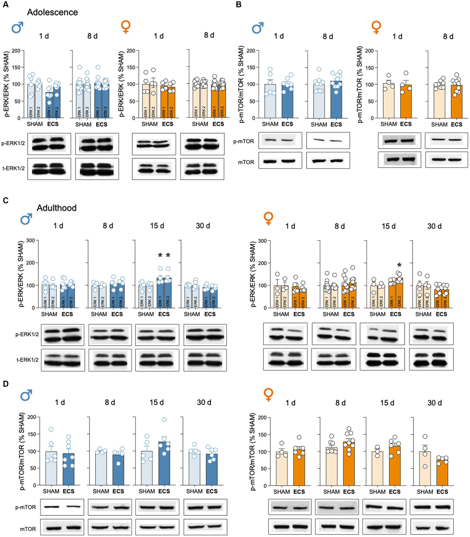 Evaluation of the protein content of certain neuroplasticity markers in hippocampus following repeated ECS treatment by western blot analysis. (A) p-ERK1/2/ERK1/2 and (B) p-mTOR/mTOR in male and female adolescent rats as measured 1-day and 8-days after treatment. (C) p-ERK1/2/ERK1/2 and (D) p-mTOR/mTOR in male and female adult rats as measured 1-, 8-, 15- and up to 30-days post-treatment. Data represents mean ± SEM of the ratio between the phosphorylated vs. total form of the protein evaluated and expressed as % change vs. SHAM-treated control rats at each particular time. Individual rates are shown for each rat (symbols). Pair comparisons for each sex and age of study were done by Student’s t-tests: **p < 0.01 vs. SHAM rats. Representative immunoblots depicting p-ERK1/2, ERK1/2, p-mTOR and mTOR are shown below each bar graph.
