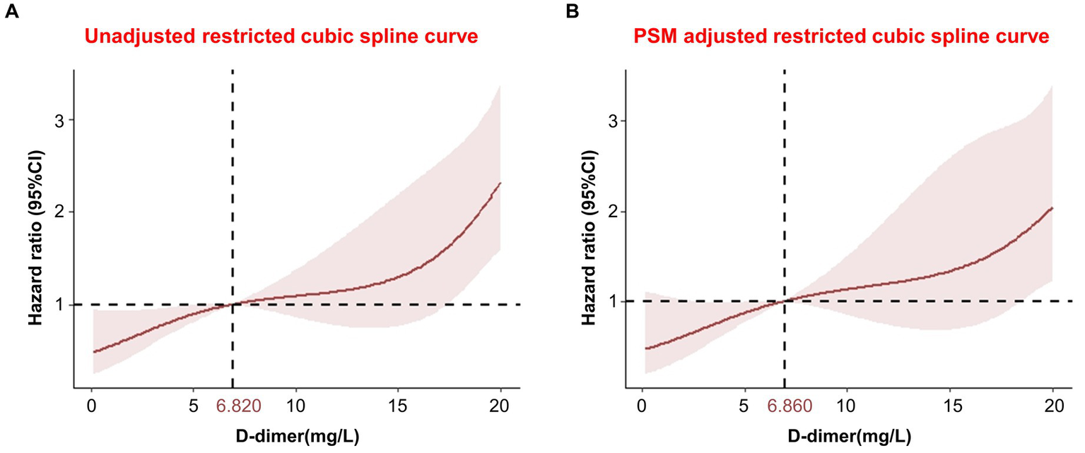 To investigate the dose–response relationship between death and D-dimer levels, we constructed a restricted cubic spline (RCS) curve. The cubic spline was adjusted for confounding factors to detect a possible nonlinear relationship between the D-dimer level as a continuous variable and long-term mortality.