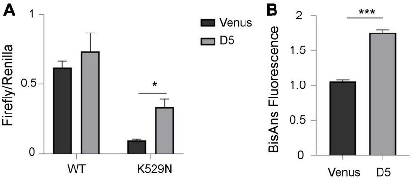 Ribosomes decode the genetic information of mRNA and synthesize proteins by accurately matching each RNA codon to the corresponding amino acid. Errors due to ribosomal dysfunction may cause incorporation of incorrect amino acids into proteins, resulting in error-prone protein synthesis (Kapur and Ackerman, 2018). Therefore, we assessed translation accuracy in cells containing polyQ-expanded ATXN1 IIBs using a luciferase activity assay (Alupei et al., 2018). This assay detects the error rate of translation at the ribosome through a reporter system with a defined mutation in the active center of firefly luciferase (K529N). Correct translation due to the incorporation of asparagine results in minimum luciferase activity. However, incorrect, error prone translation re-activates luciferase activity by the random incorporation of the activating amino acid lysine. Activity of exogenous wild-type luciferase was similar in both induced (D5) and uninduced (D0) cells, as expected. However, the activity of mutant luciferase harboring the K529N point-mutation was partially restored only in D5 Tet-On YFP-ATXN1(Q82) SH-SY5Y (Supplementary Figure 8). Next, we compared mutant luciferase activity in D5 and Venus cells. Again, the activity of mutant luciferase was significantly higher in D5 cells, suggesting that the restoration of its function is not generically affected by overexpression of a random transgene in SH-SY5Y cells (Figure 5A).