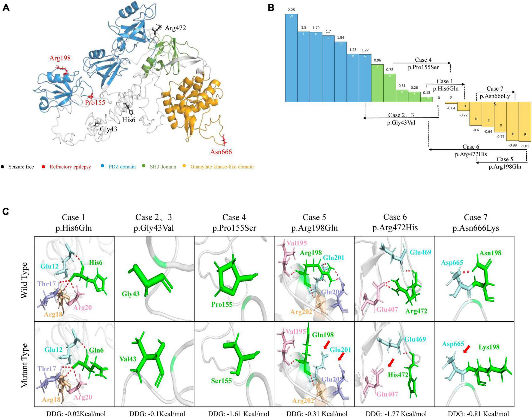 Schematic illustration of hydrogen bond changes, hydrophobicity changes and protein stability prediction. (A) Three-dimensional structure of DLG3 protein and localization of DLG3 variants of this study. (B) Fauchère and Pliska hydrophobicity scale exhibited the hydrophobicity of 20 amino acids. Abscissa: from left to right, hydrophobicity gradually decreased. Blue amino acids are hydrophobic, green amino acids are neutral, and yellow amino acids are hydrophilic. Amino acids with high positive values are more hydrophobic, whereas amino acids with low negative values are more hydrophilic. (C) Hydrogen bond changes and Gibbs free energy of folding (DDG) values of DLG3 variants. The residues where the mutations occurred are shown as green rods. The red dotted line represents hydrogen bonds. Arrows indicate the positions with hydrogen bond changes. Three of six variants were predicted to alter hydrogen bonds with surrounding residues. All variants were predicted to decrease protein stability.
