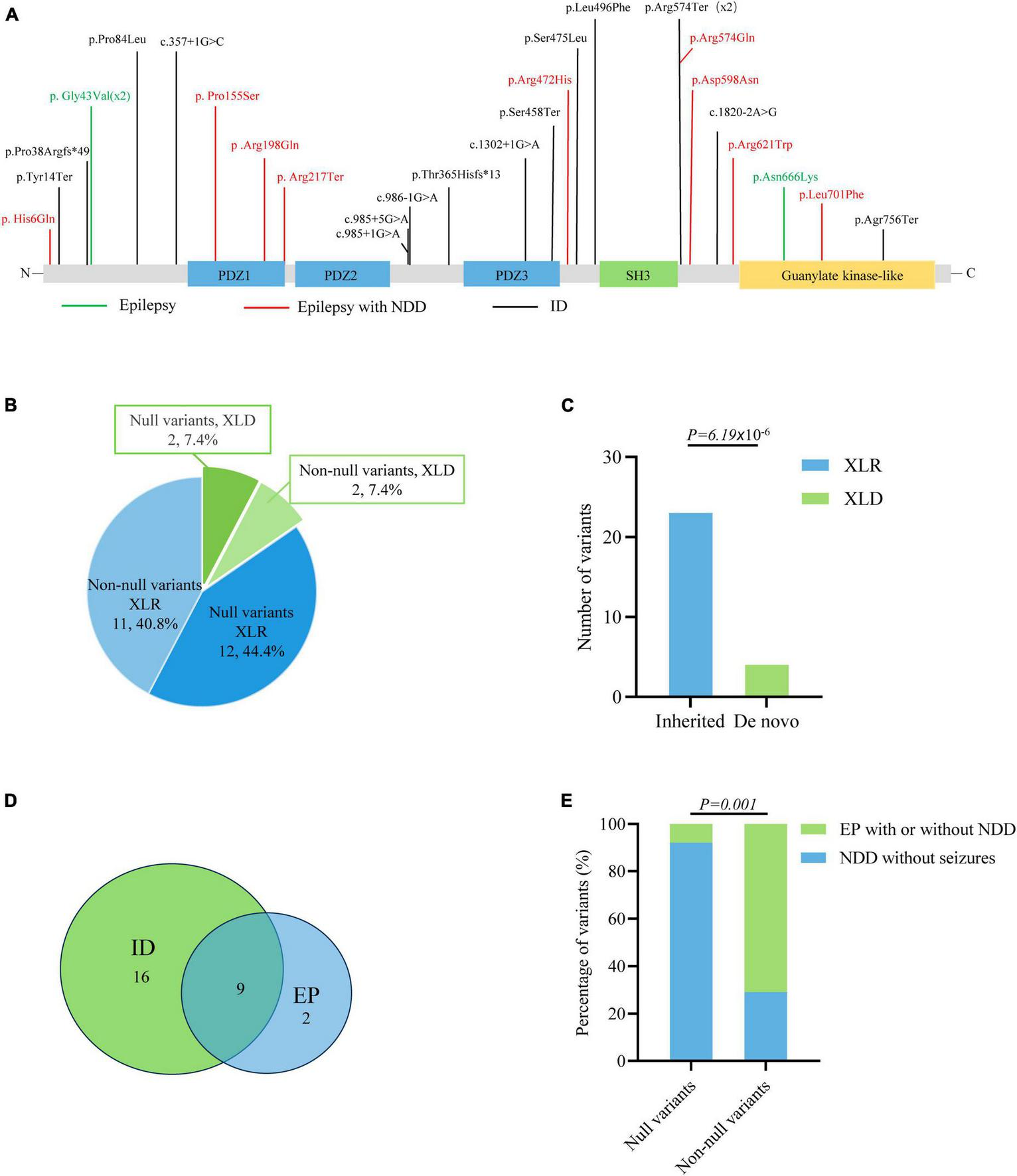 Genotype–phenotype correlation analysis of DLG3 variants. (A) Schematic diagram of the DLG3 protein and the localization of the DLG3 variants identified in this study and reported previously. Variants associated with intellectual disability (ID) are shown in black, variants associated with epilepsy are shown in green, and variants associated with epilepsy and neurodevelopmental disorders (NDDs) are shown in red. * Means termination codon. (B) Pie chart of the genotype distribution of DLG3 variants. (C) The stacked bar chart of inherited patterns and origination of the DLG3 variants (n = 27). (D) Venn diagram of the phenotypes of patients with DLG3 variants. A total of 27 variants were identified, including sixteen variants associated with intellectual disability, nine variants associated with both intellectual disability and epilepsy, and two variants associated with epilepsy. (E) The stacked bar chart of phenotypes of the variants with different genotypes. Variants with non-null variants presented higher percentages in patients with epilepsy with/without NDD than null variants (10/14 vs. 1/13; p = 0.001).