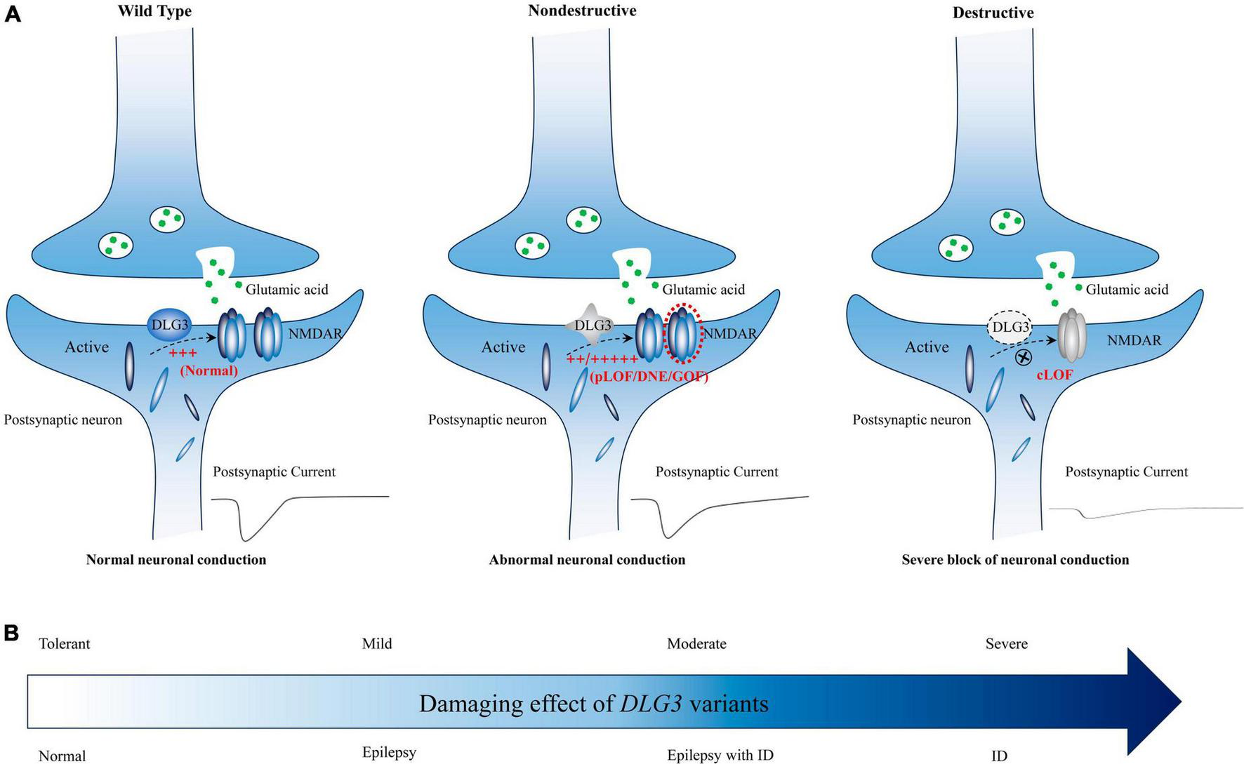 Schematic diagram of the possible association between DLG3 variants on synaptic damage and related phenotypes. (A) Possible synaptic damage and postsynaptic current alteration of various DLG3 variants. cLOF, complete loss of function; DNE, dominant-negative effects; GOF, gain of function; NMDARE, N-methyl-D-aspartate receptors; pLOF, partial loss of function. (B) The possible association between phenotypes and synaptic damage. Variants of mild or moderate damage would cause subtle functional alteration of synapse with abnormal electrophysiological activity and subsequently epilepsies and/or intellectual disability; while variants of complete loss of function would lead to decreased synaptic conduction, subsequently intellectual disability.