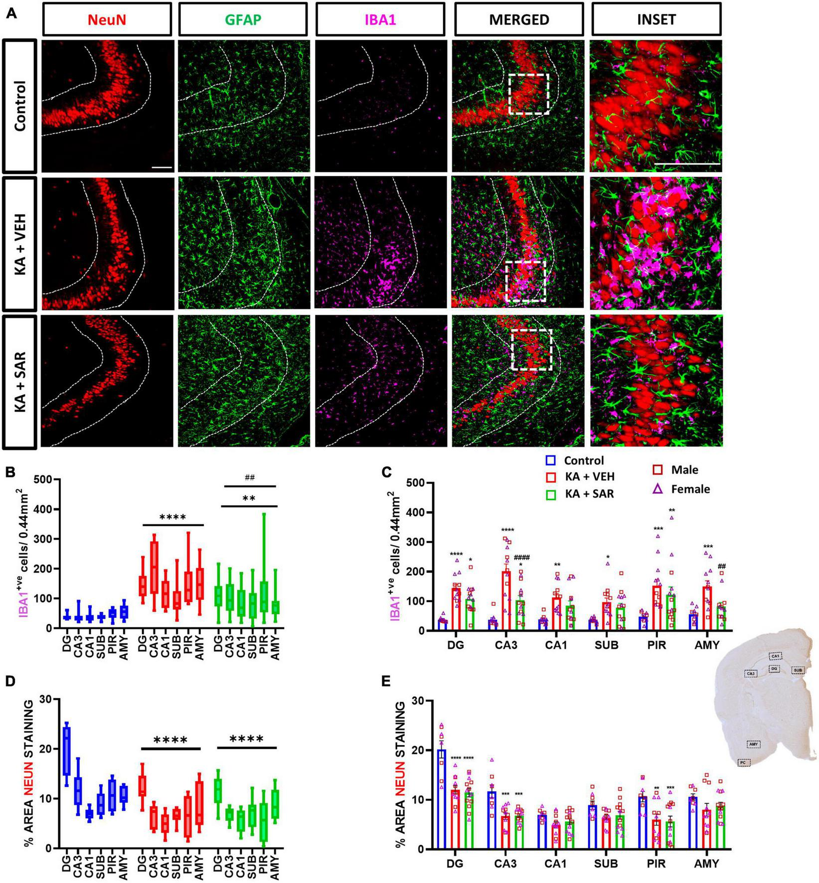 Representative images of the CA3 region of the brain stained for NeuN, GFAP and IBA1 are shown in Figure 2A and Supplementary Figure 2. KA-induced SE caused significant increases in microglia (IBA1-positive cells) in all brain regions of interest in the vehicle-treated group compared to controls (Figure 2C) 8 days post-SE. SAR-treated rats also had a significant increase in microglia cell counts in the DG, CA3 and PIR regions versus the controls (Figure 2C). SAR treatment significantly reduced microgliosis in the CA3 and AMY regions of the brain when compared to vehicle-treated rats. Two-way ANOVA revealed no significant sex and treatment interactions across any of the regions of interest. Overall, in the mixed-effects analysis across all brain regions, we found significant increases in microgliosis in both KA-treated groups versus controls, with a significant reduction in microgliosis in the SAR-treated group versus the KA vehicle group (Figure 2B).