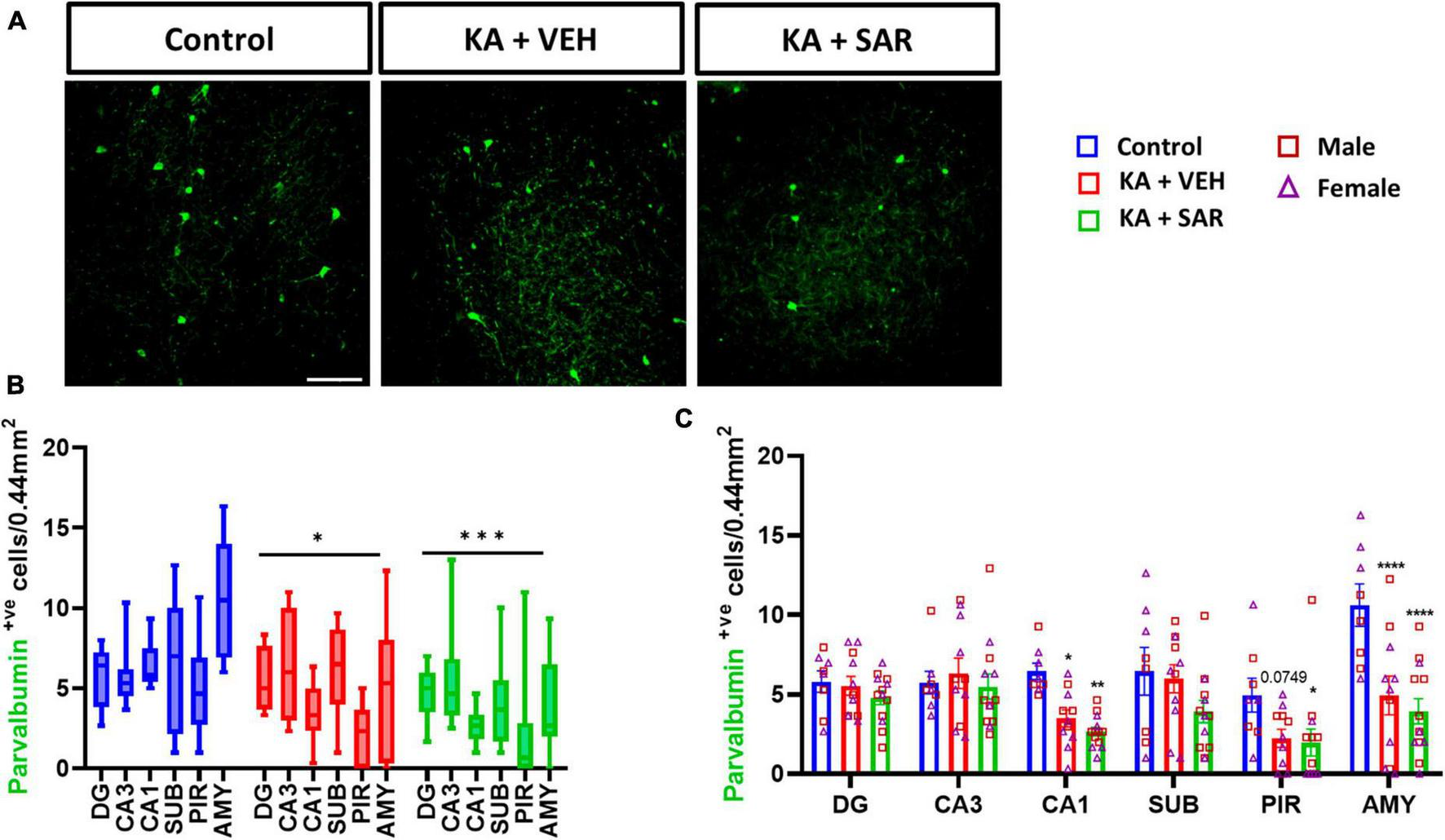 We observed an overall significant reduction of NeuN staining in all regions of the brain in the KA-treated groups versus the controls (Figure 2D), primarily driven by significant reductions of NeuN staining in the DG, CA3 and PIR (Figure 2E). We did not observe significant sex differences in any of the regions of interest (Figure 2E). Histologically, the regions of neuronal loss coincided with regions of reactive microglial infiltration and astrogliosis (Figure 2A, Supplementary Figure 2). SAR had no effect on mitigating the SE-induced neuronal loss. We further examined parvalbumin (PV) positive neurons, a subset of GABAergic inhibitory interneurons. Representative PV staining in the AMY is shown in Figure 3A and Supplementary Figure 3. We noted significant inhibitory neuronal loss in the CA1 and AMY regions of the brain in both KA groups versus the controls (Figure 3C). Interestingly, there was significant PV neuronal loss in the PIR region of SAR treated rats compared to the controls (Figure 3C). No significant sex differences were observed in PV neuronal loss. Overall, we noted significant parvalbumin-positive neuronal loss in the KA groups irrespective of SAR or vehicle treatment (Figure 3B).