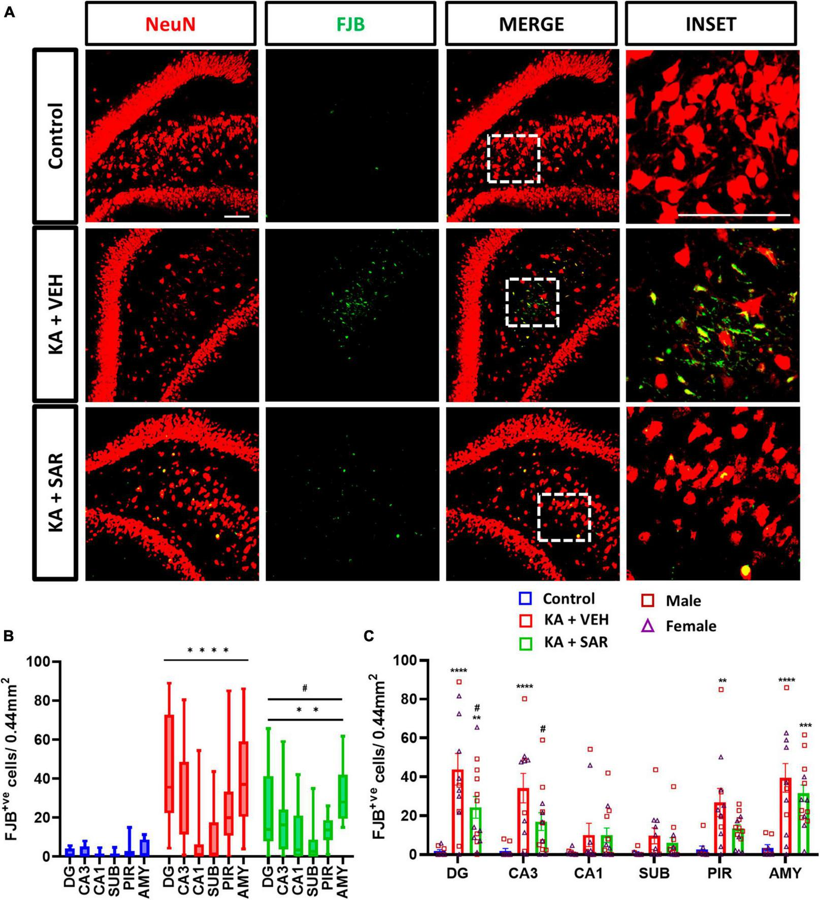 SAR treatment significantly attenuated SE-induced neurodegeneration. (A) Representative images of degenerating neurons (FJB positive cells) in the DG region of the hippocampus from the different treatment groups. Scale bar 100 μm. (B,C) Neurodegeneration in the hippocampal regions (DG, CA3, CA1, SUB), piriform cortex (PIR) and amygdala (AMY). (B,C) Repeated measures two-way ANOVA (Tukey’s multiple comparisons test). n = 8–14. **p < 0.01, ***p < 0.001, ****p < 0.0001 vs. control; #p < 0.05 vs. KA+VEH. (C) Data represented as mean ± SEM.