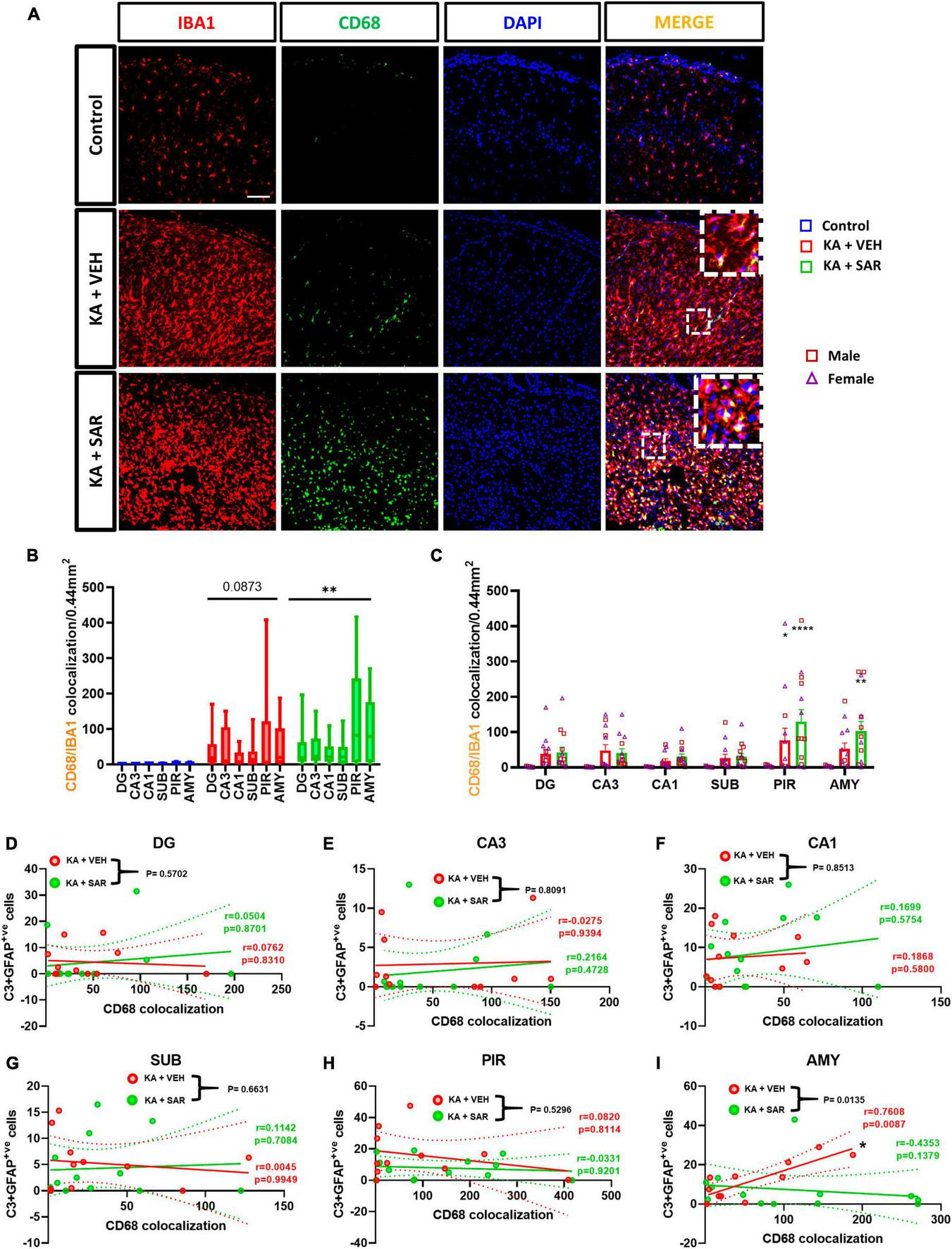CD68 was used as a marker for phagocytic or reactive microglia (Kettenmann et al., 2011). Representative images from the PIR are shown in Figure 6A and Supplementary Figure 6. The KA-VEH group showed significant increases in CD68+IBA1 colocalization only in the PIR (Figure 6C). Interestingly, unexpectedly, we observed significant increases in CD68+IBA1 colocalization in the PIR and AMY regions in SAR treated group (Figure 6C). However, we did not find significant sex differences in phagocytic microgliosis in any of the regions. Overall, KA treatment caused increases in phagocytic microgliosis in both groups across the brain regions versus the controls, with SAR-treated animals showing significant overall increases in CD68+IBA1 colocalization (Figure 6B). We further examined the relationship of CD68-positive microgliosis and C3-positive astrogliosis in the different brain regions (Figures 6D–I). We noted a significant and strong positive correlation (p = 0.0087) between CD68 expression and reactive astrogliosis in the AMY region of the brain in the VEH-treated group, and SAR treatment significantly mitigated this effect (p = 0.0135) (Figure 6I).