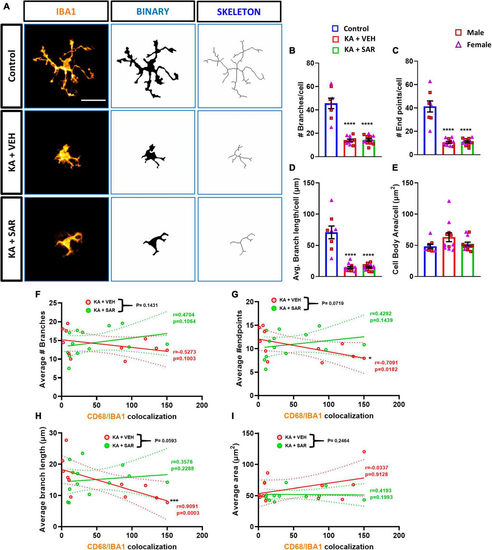 Representative images of IBA1 cells and corresponding skeletonized images are shown in Figure 7A. We observed a significant reduction in the number of branches, endpoints, and average branch length of microglia in KA-treated groups versus the controls (Figures 7B–D). These results indicate a change in the morphology of microglia from the resting, ramified type to the reactive, amoeboid type. Interestingly, there were no significant differences in the area of the cell bodies between the treatment groups (Figure 7E). These findings indicate that kainic acid-induced the polarization of microglia to the reactive type, and SAR did not prevent microglia polarization. There were no significant sex differences across any of the morphological parameters. We thus further investigated the relationship of microglial morphological parameters with the extent of CD68 expression in the CA3 region of both KA-treated VEH and SAR groups (Figures 7F–I). There was a strong and significant negative correlation between the average number of endpoints (p = 0.0182) and the average branch length (p = 0.0003) of microglia with the CD68 colocalization counts from the corresponding regions in the vehicle-treated group (Figures 7G, H). SAR treatment mitigated the relationship between microglial morphological state and phagocytic activity (Figures 7G, H). However, we did not observe significant correlations between the number of microglial branches (Figure 7F), microglial cell body area (Figure 7I) and CD68 expression in either of the groups.