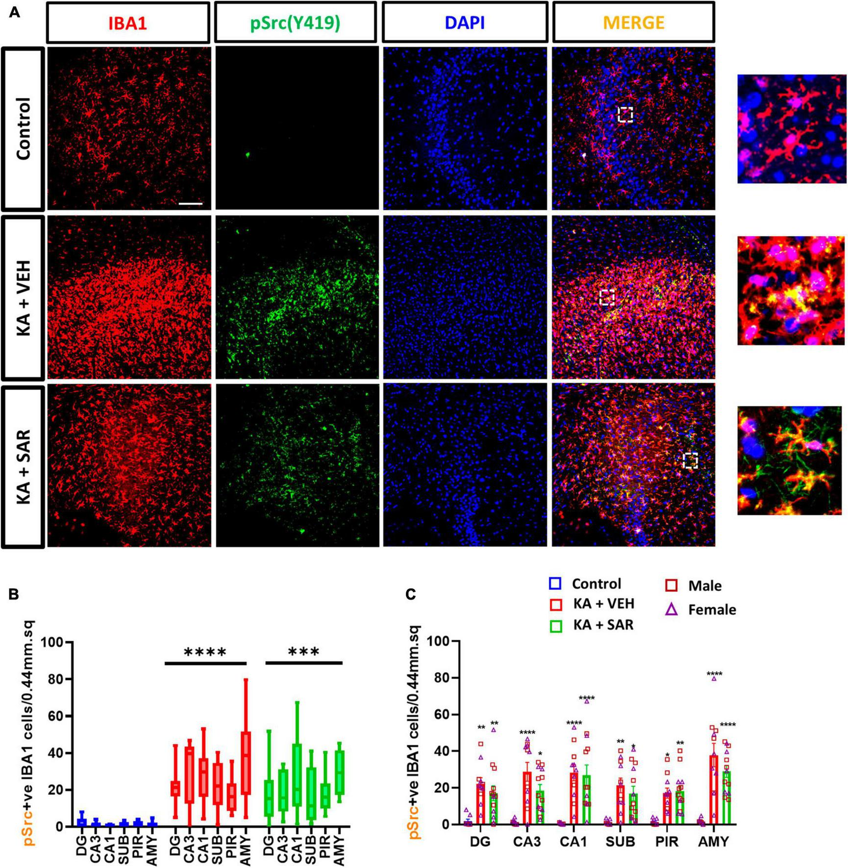 SAR is a potent and highly selective inhibitor of Src/Abl kinase (Hennequin et al., 2006; Green et al., 2009). Our previous SAR studies demonstrated reductions in the levels of pSrc from whole-hippocampal lysates at 8 days post-SE with a different dosing regimen (Sharma et al., 2021a). In this study we did not observe a significant reduction in pSrc-positive microglia in the SAR-treated group, although we observed a trend in the reduction in all regions of the brain except the piriform cortex. Moreover, SFKs are also expressed in neurons, which we did not investigate in this study. It is also worth noting that the affinity of SAR for activated Src(pSrc) is ten times higher than for native Src, and inconsistent reductions in the levels of pSrc(Y419) after SAR treatment have been reported (Green et al., 2009). Therefore, while interpreting the pSrc(Y419) changes, the cell types, the region, and the role of other Src tyrosine family members involved in the process should be considered.