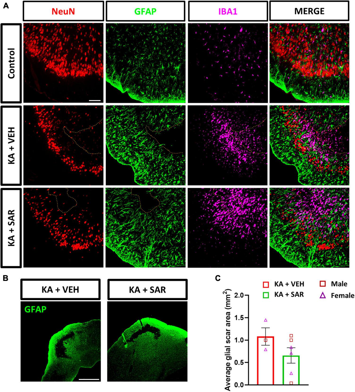 KA-induced SE led to the formation of classical glial scars in the piriform cortex of the brain. (A) Representative images of the PIR region showing glial scars (dotted line) in the KA-treated groups versus the similar region of a control animal stained for NeuN (neurons), GFAP (astrocytes) and IBA1 (microglia). Scale bar 100 μm. (B) Representative low-magnification images of glial scars in the PIR of KA-treated rats. Scale bar 1,000 μm. (C) There was a 42.17% reduction in the size of the glial scar of the SAR-treated group versus the VEH. Unpaired t-test, n = 3–6. (C) Data represented as mean ± SEM.