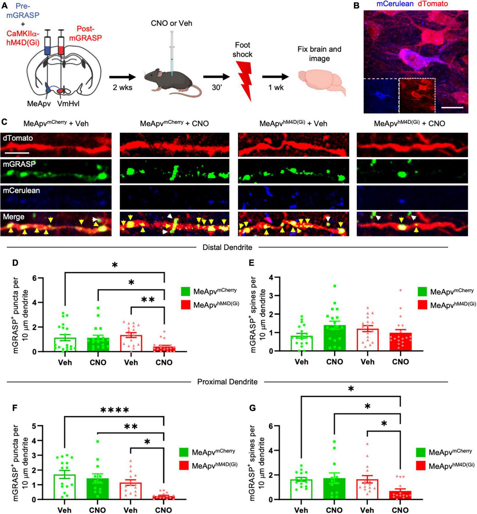 Chemogenetic inhibition of excitatory MeApv neurons suppresses foot shock-induced increases in mGRASP puncta on VmHvl dendritic shafts. (A) Experimental schedule for chemogenetically inhibiting excitatory MeApv neurons before foot shock. Mice received injections of pre-mGRASP and hM4D(Gi) (the inhibitory DREADD receptor) into the MeApv, and post mGRASP into the VmHvl. (B) Representative images of an MeApv neuron expressing pre-mGRASP and hM4D(Gi) (conjugated to mCherry). Scale bar = 25 mm. (C) Representative images of mGRASP on dTomato-expressing VmHvl dendrites 7 days post-foot shock for all four conditions: mice that were injected with vehicle and expressed mCherry control virus in the MeApv (MeApvmCherry + Veh); mice that were injected with CNO and expressed mCherry in the MeApv (MeApvmCherry + CNO); mice that were injected with vehicle and expressed hM4D(Gi) in the MeApv (MeApvhM4D + Veh); mice that were injected with CNO and expressed hM4D(Gi) in the MeApv (MeApvhM4D + CNO). Yellow arrows indicate shaft synapses and white arrows indicate spine synapses. Scale bar = 5 mm. Quantification of mGRASP puncta on the shafts (D,F) or spines (E,G) of distal dendrites (n = 19 dendrites from 3 MeApvmCherry + Veh mice, 18 dendrites from 3 MeApv MeApvmCherry + CNO mice, 17 dendrites from 3 MeApvhM4D + Veh mice, and 19 dendrites from 3 MeApvhM4D + CNO mice) or proximal dendrites (n = 15 dendrites from 3 MeApv MeApvmCherry + Veh mice, 12 dendrites from 3 MeApv MeApvmCherry + CNO mice, 15 dendrites from 3 MeApvhM4D + Veh mice, and 14 dendrites from 3 MeApvhM4D + CNO mice) from all conditions, normalized to 10 mm length segments. Mean ± SEM, *p < 0.05, **p < 0.01, ****p < 0.0001.