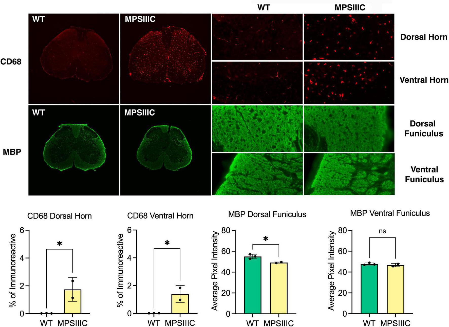 Microglial activation and white matter changes in the lumbar spinal cord of 6-month-old MPS IIIC mice. Representative images of immunostaining for the microglial marker CD68 (red) and myelin basic protein (MBP green) in the lumbar cord of 6-month-old HgsnatP304L (MPS IIIC) mice and age-matched WT mice. Numerous CD68 immunoreactive microglia with enlarged cell soma are present in the gray and white matter of the dorsal and ventral horn of MPS IIIC mice but are virtually absent in WT mice at this age. Compared to age-matched WT mice, MBP immunoreactivity is moderately reduced in the dorsal funiculus of 6-month-old MPS IIIC mice, but unchanged in the ventral funiculus. Quantitative thresholding image analysis confirmed these observations revealing significantly elevated CD68 immunoreactivity in the dorsal and ventral horn of 6-month-old MPS IIIC vs. age-matched WT mice. Similarly, there was significantly less MBP immunoreactivity in the dorsal funiculus of 6-month-old MPS IIIC vs. age-matched WT mice, but no significant change in the ventral funiculus. All graphs show individual data, means and SD obtained for two mice per genotype. P-values were calculated using an unpaired t-test (*P < 0.05; ns, non-significant).