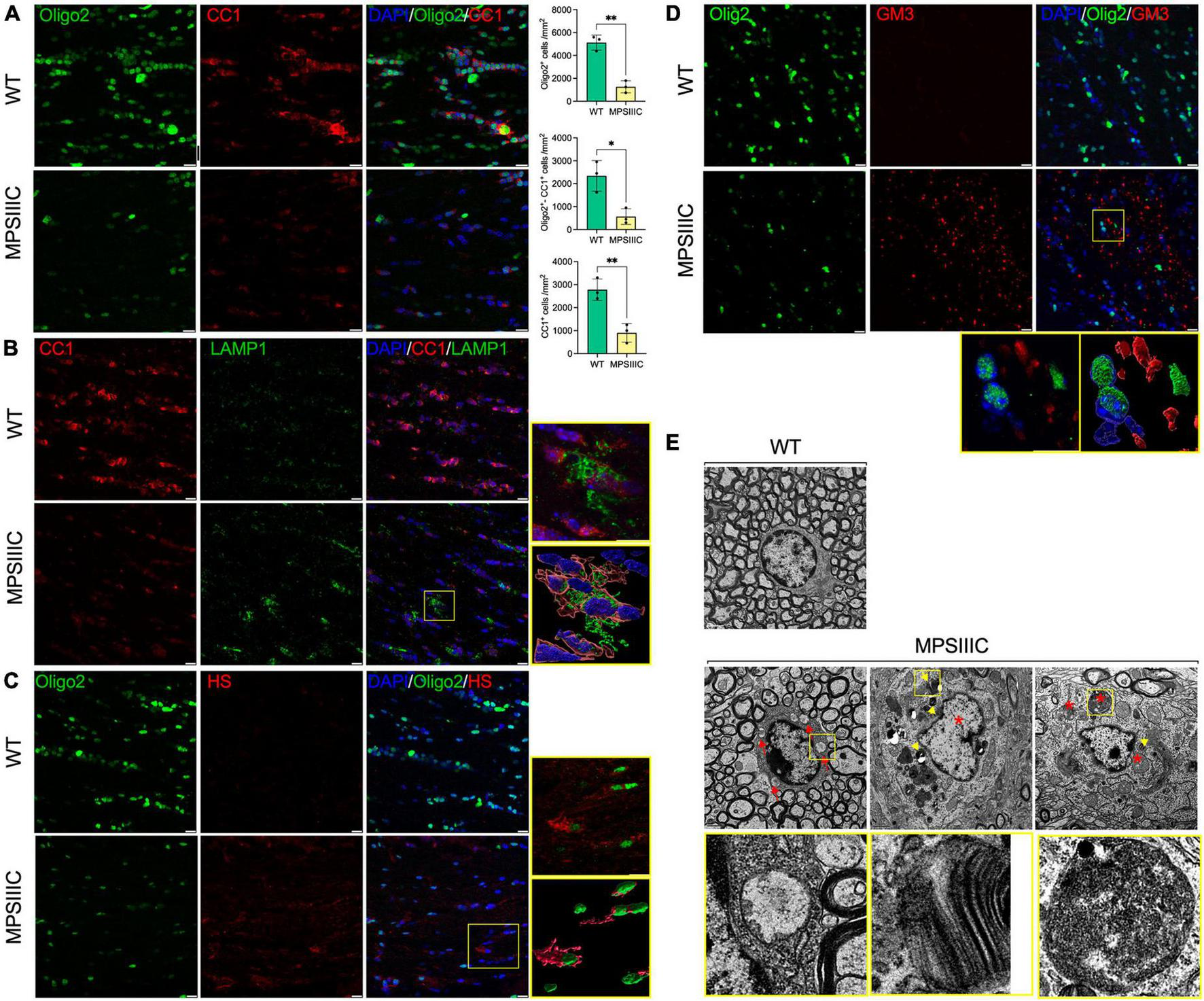 The reduced number of OLs coincided with severe morphological changes observed in most of the remaining cells. Specifically, the number and size of LAMP1-positive vacuoles in OLs were increased, consistent with a lysosomal storage phenotype (Figure 5B). Our previous studies revealed that HGSNAT deficiency and impairment of HS catabolism resulted in intralysosomal accumulation of both primary (HS) and secondary (gangliosides) storage materials in neurons and microglia in the brains of MPS IIIC mice (Martins et al., 2015; Pan et al., 2022). To investigate if both compounds are also stored in OLs of MPS IIIC mice, brain tissues were studied by immunohistochemistry using the 10E4 monoclonal antibody, specific for a native HS epitope, and the anti-GM3 ganglioside monoclonal antibody. These experiments revealed increased storage of both HS and GM3 gangliosides in multiple Oligo2-positive cells (Figure 5C and Supplementary Figure 4). TEM analysis further confirmed that OLs in the CC of MPS IIIC mice [identified by the shape and pattern of their nuclei and the presence of multiple microtubular structures in the cytoplasm (Peters and Folger, 2013)] contained multiple storage vacuoles. Some vacuoles exhibited an electrolucent content compatible with storage of HS (Martins et al., 2015; marked with red arrowheads and boxed in Figure 5D), while others contained zebra bodies suggesting storage of myelin fragments or/and sphingolipids (Pagni et al., 2012; marked with yellow arrowheads and boxed in Figure 5D). In addition, OLs in the CC of MPS IIIC mice contained swollen mitochondria with largely dissolved cristae (marked with asterisks in Figure 5E), similar to those we have previously identified in the neurons of MPS IIIC mice (Martins et al., 2015).