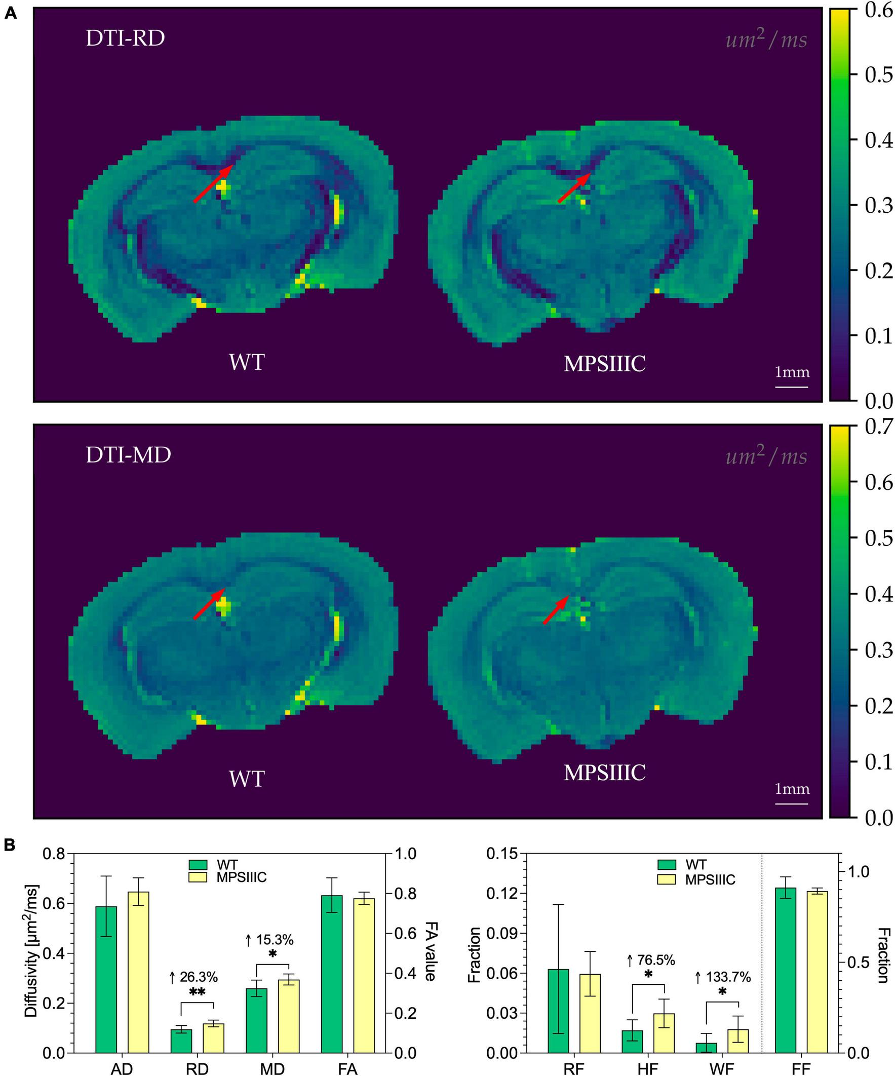 Diffusion maps from DTI and diffusion metrics from DTI and DBSI for WT and MPS IIIC mice. (A) Representative images of Radial diffusivity (RD) and Mean diffusivity (MD) maps for brains of WT and MPS IIIC mice demonstrating an increase for both parameters in MPS IIIC brain compared to WT mice. Arrows show the corpus callosum. Diffusivity scale (μm2/ms) is shown in the right sidebar. RF, restricted fraction; HF, hindered fraction; WF, water fraction; FF, fiber fraction; AD, axial diffusivity; RD, radial diffusivity; MD, mean diffusivity and FA, fractional anisotropy. (B) Bar plots of diffusion metrics from DTI (left) and DBSI (right) of WT and MPS IIIC mice. RD, radial diffusivity; MD, mean diffusivity; Graphs show means ± SD for eight WT (green bars) and 10 MPS IIIC (yellow bars) mice. **P < 0.01, *P < 0.05.