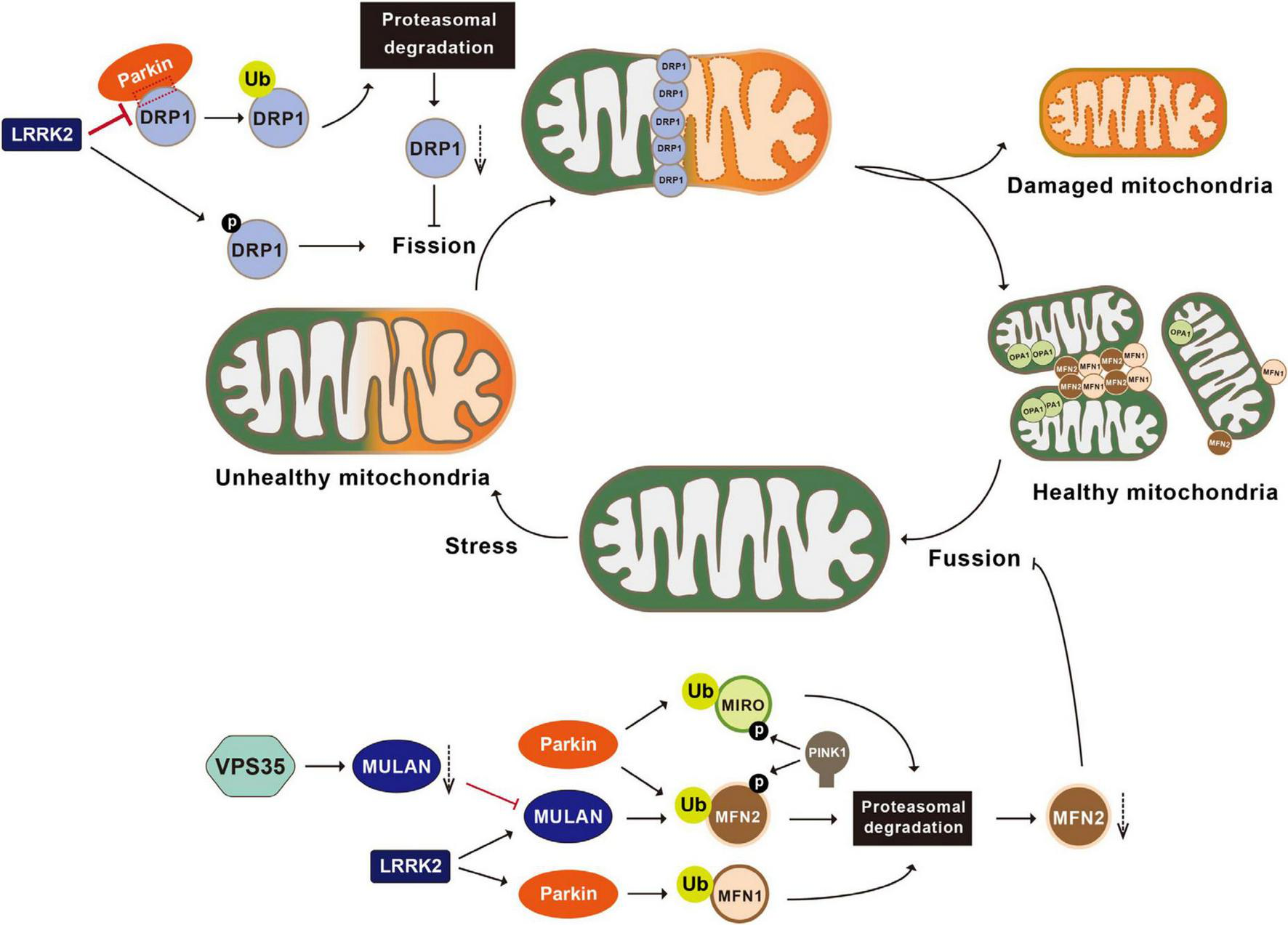 Post-translational modifications in the regulation of mitochondrial dynamics. Mitochondria undergo constant fusion (joining two mitochondria together with the help of MFN1, MFN2, and OPA1) and fission (separating one mitochondrion into two mitochondria with the help of DRP1). Parkin ubiquitinates DRP1, leading to the proteasomal degradation of DRP1 and inhibiting mitochondrial fragmentation. LRRK2 phosphorylates DRP1, impairs the interactions between Parkin and DRP1, and activates MULAN and Parkin’s E3 ligase activities, therefore regulating mitochondrial fragmentation. VPS35 regulates the degradation of the MULAN, thereby inhibiting MUL1 mediated ubiquitination and degradation of MFN2 and promoting mitochondrial fusion. Parkin ubiquitinates MFN1, MFN2 and MIRO, leading to their degradation via the proteasomal system and inhibiting mitochondrial fusion. PINK1 phosphorylates MIRO and activates Parkin mediated ubiquitination and degradation of MIRO. MFN1, mitofusin 1; MFN2, mitofusin 2; OPA1, optic atrophy 1; LRRK2, leucine-rich repeat kinase 2; VPS35, vacuolar protein sorting 35; MULAN, mitochondrial E3 ubiquitin protein ligase; MIRO, mitochondrial Rho GTPase.