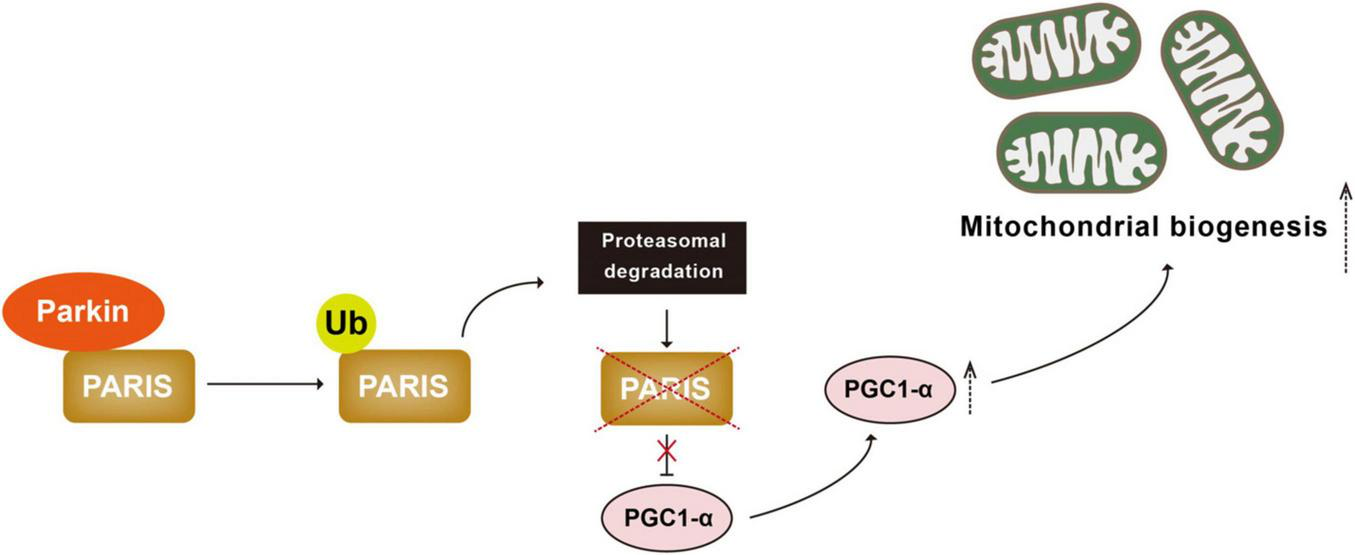 Parkin-mediated ubiquitination regulates mitochondrial biogenesis. PARIS binds to and represses PGC 1α, the master regulator of mitochondrial biogenesis. Parkin interacts with and ubiquitinated PARIS, leading to its proteasomal degradation and promoting mitochondrial biogenesis. PARIS, Parkin-interacting substrate; PGC 1α, peroxisome proliferator-activated receptor gamma coactivator 1-alpha.