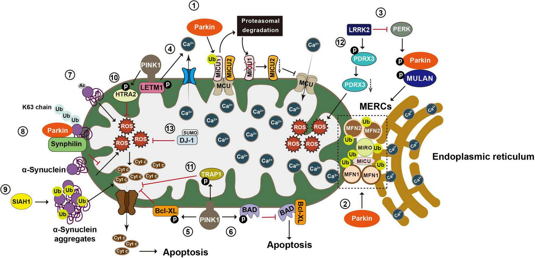 Post-translational modifications in the regulation of calcium homeostasis, oxidative stress, and apoptosis. Mitochondria play an essential role in maintaining Ca2+ homeostasis, regulating oxidative stress, and integrating apoptosis signals. (1) Mitochondria take up Ca2+ through the MCU complex, which is positively and negatively regulated by MICU1 and 2, respectively. Parkin regulates mitochondrial calcium homeostasis by directly ubiquitinating MICU1, leading to its proteasomal degradation, and indirectly affecting MICU2’s protein level. (2) Parkin also regulates calcium homeostasis by ubiquitinating tethering proteins involved in mitochondria endoplasmic reticulum contact sites (MERCs), such as MFN1, MFN2, MIRO1, and MICU. (3) LRRK2 blocks PERK mediated phosphorylation and activation of Parkin and MULAN, causing increased degradation of MERCS tethering proteins and reduced ER mitochondrial contacts. (4) PINK1 phosphorylates LETM1, leading to increased calcium release and facilitating calcium transport in mitochondria. (5) PINK1 phosphorylates Bcl XL and prevents its pro apoptotic cleavage. (6) PINK1 also phosphorylates BAD and prevents the formation of pro apoptotic Bcl XL BAD complex. (7) N α acetylation of α synuclein induces mitochondrial dysfunction. (8) Parkin increases K63-linked Ub chains on α synuclein, leading to the recruitment of Synphilin 1 to inhibit α synuclein toxicity. (9) SIAH-1 facilitates ubiquitination of α synuclein, increasing α synuclein’s insolubility and exacerbating its aggregation associated toxicity. (10) PINK1 mediated phosphorylation enhances the proteolytic activity of HTRA2 and protects cells against mitochondrial stress. (11) Phosphorylation of TRAP1 by PINK1 inhibits cytochrome c release and reduces cell death during oxidative stress. (12) LRRK2 phosphorylates PRDX3 and decreases its peroxidase activity. (13) SUMOylation of DJ 1 is crucial for of DJ 1’s anti-ROS activity. MCU, mitochondrial calcium uniporter; MICU1, mitochondrial calcium uptake 1; MICU2, mitochondrial calcium uptake 2; MFN1, mitofusin 1; MFN2, mitofusin 2; MIRO1, mitochondrial Rho GTPase 1; LRRK2, leucine-rich repeat kinase 2; PERK, protein kinase RNA-like ER kinase; LETM1, leucine zipper-EF-hand-containing transmembrane protein 1; ER, endoplasmic reticulum; Bcl XL, B-cell lymphoma-extra large; BAD, BCL2 associated agonist of cell death; Ub, ubiquitin; SIAH-1, seven in absentia homolog-1; HTRA2, high-temperature requirement serine protease A2; TRAP1, TNF receptor-associated protein 1; PRDX3, peroxiredoxin 3; ROS, reactive oxygen species.