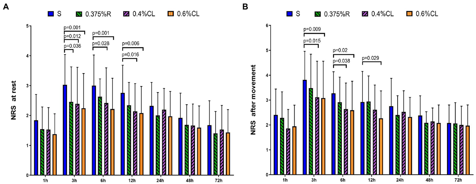 As shown in Figure 2, NRS scores at rest were lower in Group 0.375% R than Group S at 3 h (p = 0.036) after surgery. Furthermore, as compared to Group S, patients in Group 0.4% CL exhibited the lower NRS scores at rest at postoperative 3 h (p = 0.012), 6 h (p = 0.028), and 12 h (p = 0.016) and NRS scores after movement at 3 h (p = 0.015) and 6 h (p = 0.038) after surgery. Strikingly, NRS scores at rest were lower in Group 0.6% CL than Group S at 3 h (p = 0.001), 6 h (p = 0.001), and 12 h (p = 0.006) after surgery. NRS scores after movement were also lower in Group 0.6% CL than Group S at 3 h (p = 0.009), 6 h (p = 0.02), and 12 h (p = 0.029) after surgery.