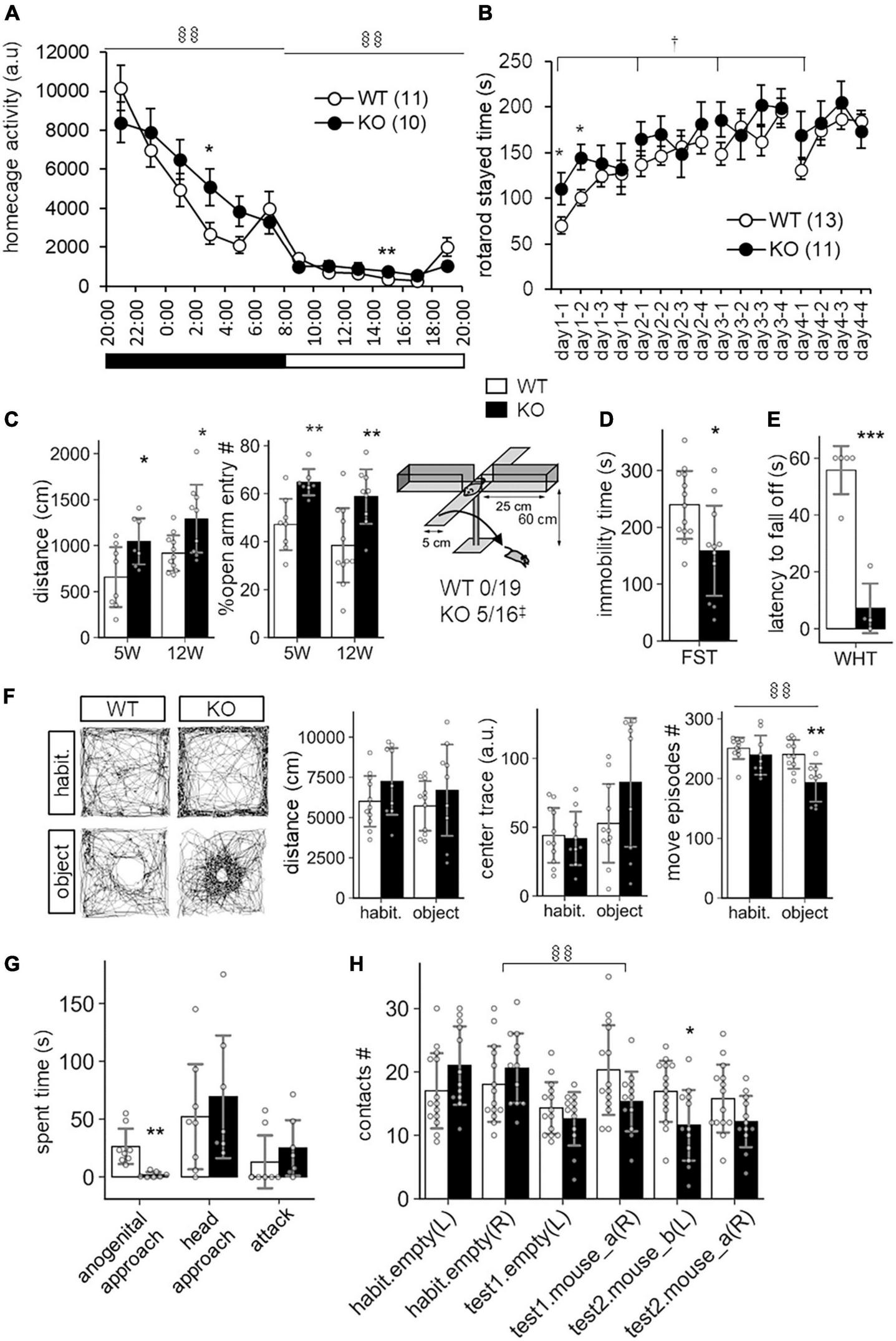 Adult male Slitrk3 KO (Slitrk3TM1Jaru/Slitrk3TM1Jaru, Slitrk3–/–) and WT mice (Slitrk3+/+, 8–32-week-old, littermates from mated heterozygotes) were used for behavioral tests. Male mice were used to avoid the effects of estrous cycles on behavioral phenotypes in females (Meziane et al., 2007). Mice were housed in a 12:12 h light-dark cycle, with the dark cycle occurring from 20:00 to 8:00, and behavioral experiments were carried out between 10:00 and 17:00. Please see Supplementary Data for a description of these behavioral experiments.