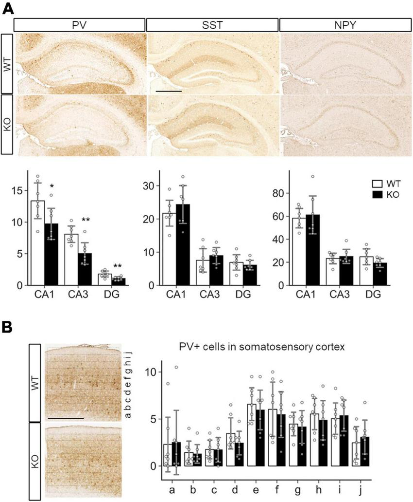 Mice were anesthetized with inhalation of isoflurane. Cardiac perfusion was performed with 4% paraformaldehyde and 0.1 M sodium phosphate (pH 7.4). Excised brains were fixed in the same fixative for 4 h at room temperature with gentle agitation. Tissue blocks were cryoprotected with 20% sucrose in PBS at 4°C overnight and frozen in OCT compound (Sakura Finetek). Cryosection was performed using a CM3050 cryostat (Leica Biosystems) at a thickness of 12 μm. After sectioning, sections were immersed in PBS(-) for 5 min, followed by 0.3% hydrogen peroxide in methanol for 10 min at room temperature. After immersion in PBS(-), the sections were blocked with 1% skim milk (Difco), 2% normal goat or donkey serum and 0.1% Triton X-100 in PBS (-) at room temperature for 1 h and reacted with mouse anti-parvalbumin monoclonal antibody (Sigma-Aldrich, P3088, 1:4000), goat anti-somatostatin antibody (Santa-Cruz, SC7819, 1:250), or sheep anti-neuropeptide Y antibody (Millipore, AB1583, 1:500) at 4°C for 0.5–2.5 days. The bound antibody was detected by VECTASTAIN Elite ABC kits (Vector Laboratories) and 3,3′-diaminobenzidine (DOJINDO). For the immunostaining using anti-somatostatin antibody or anti-neuropeptide Y antibody, the sections were autoclaved (105 C for 5 min) in 10 mM sodium citrate (pH 6.0) before the peroxidase-methanol treatment for antigen retrieval. Images were acquired with an NDP slide scanner (Hamamatsu Photonics). For quantitative analyses, all stained images were taken with the same settings and manually counted by observers who were blinded to the genotypes.