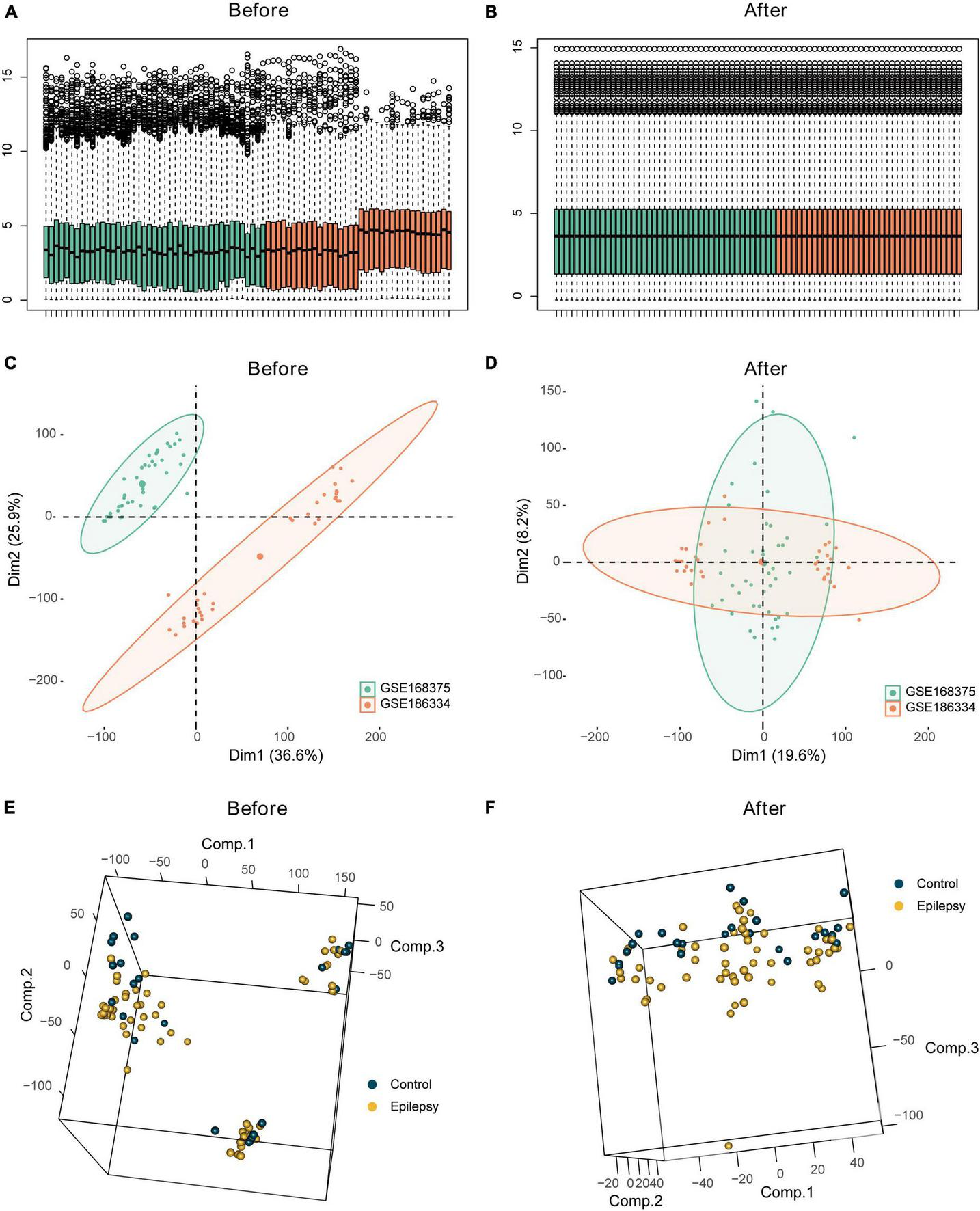 Batch effect analysis of the integrated epilepsy dataset. Box plots depicting combined epilepsy data pre- (A) and post- (B) batch correction. Batch analysis of combined epilepsy data pre- (C) and post- (D) batch correction employing PCA. Employment of PCA for differential analysis of epilepsy and control groups pre- (E) and post- (F) batch correction in the integrated epilepsy dataset.