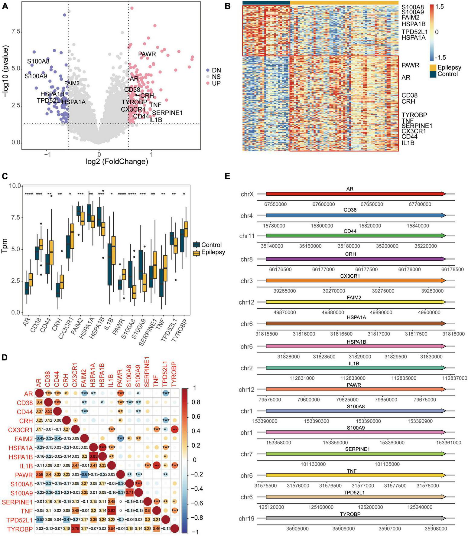 Differential expression analysis of the integrated dataset between the epilepsy group and the control group. (A) Volcano plot of the DEGs. (B) Heatmap of the DEGs. (C) Box plot showing the expression of apoptotic genes that are differentially expressed. (D) Spearman correlation heatmap showing the correlation of DEARGs. (E) Diagram showing the positions of DEARGs on the chromosomes. *P < 0.05, **P < 0.01, ***P < 0.001, ****P < 0.0001. UP, up-regulated; DN, down-regulated; NS, not significant.