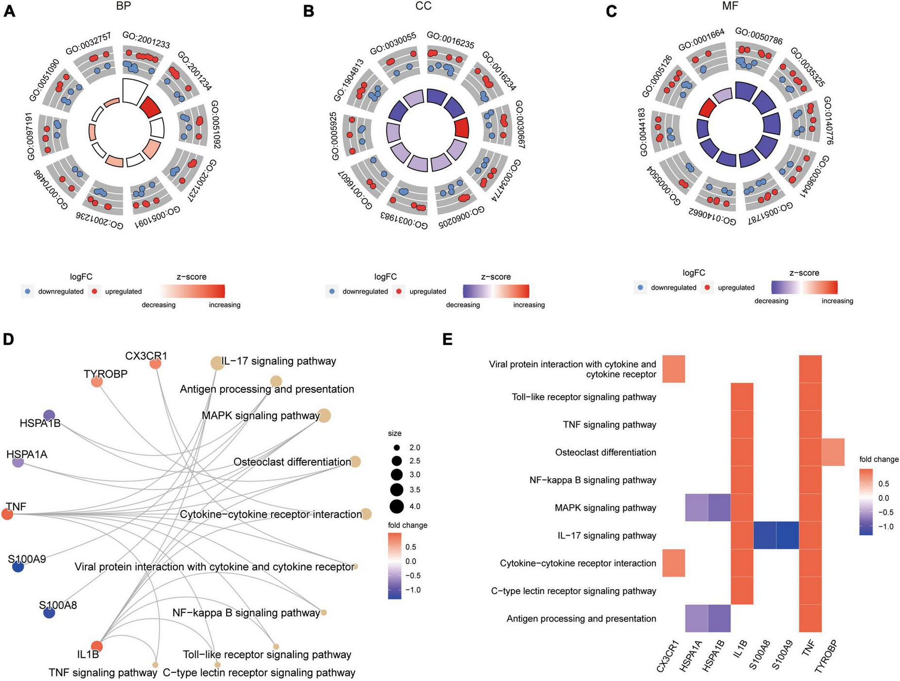 GO and KEGG enrichment results of DEARGs between the epilepsy group and the control group. (A–C) Enriched GO pathways associated with Biological Process (A), Cell Component (B) and Molecular Function (C). LogFC represents the log2 (fold change) of gene expression between epilepsy group and control group. (D) Enriched KEGG pathways. Dot size represents the number of genes in the pathway. (E) Heat map of enriched KEGG pathways.