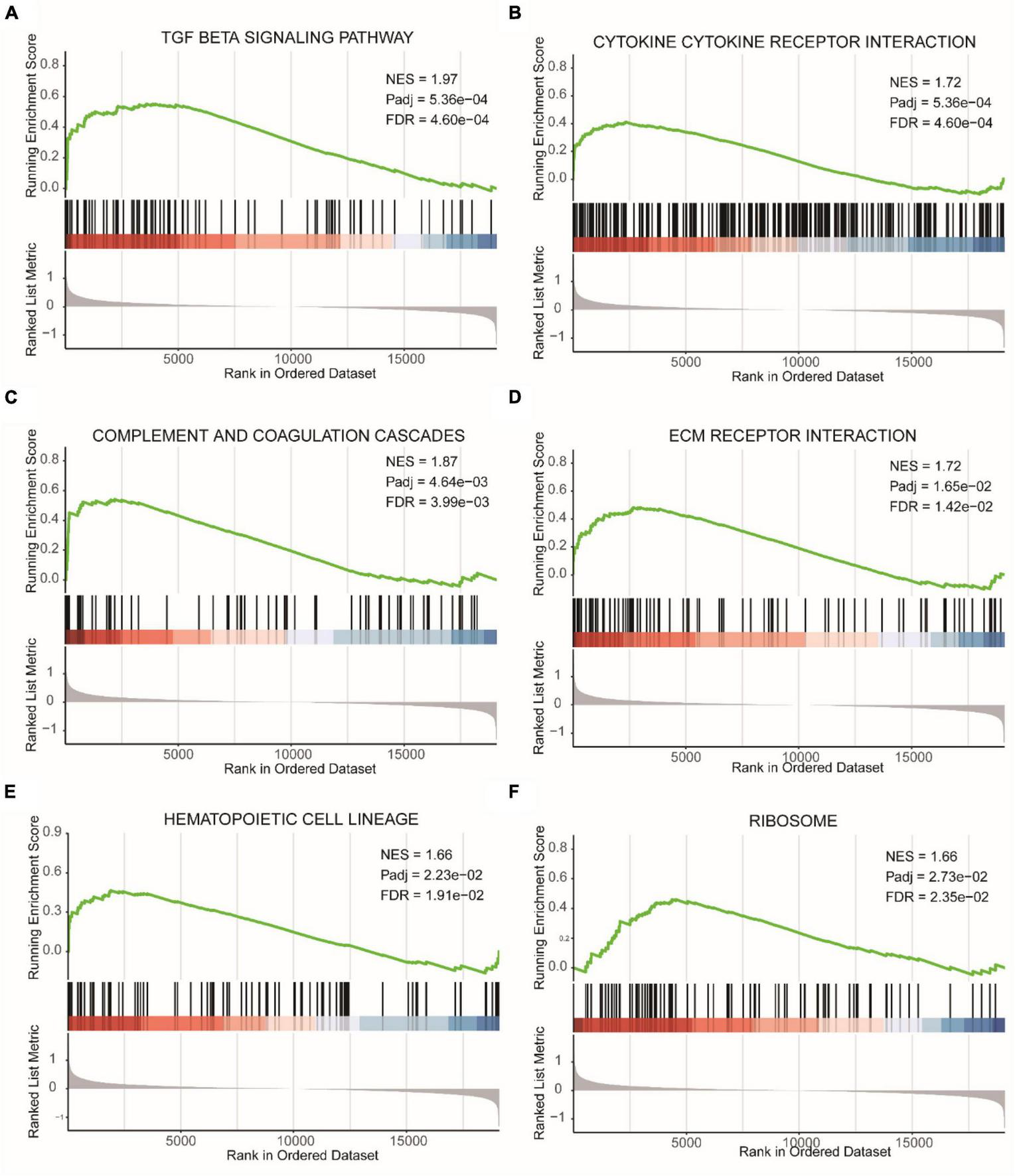 GSEA results of epilepsy group and the control group. (A) TGF beta signaling pathway. (B) Cytokine cytokine receptor interaction. (C) Complement and coagulation cascades. (D) ECM receptor interaction. (E) Hematopoietic cell lineage. (F) Ribosome. NES, Normalized Enrichment Score. Pathways with FDR (False Discovery Rate) < 0.05 are generally considered to be statistically significant.