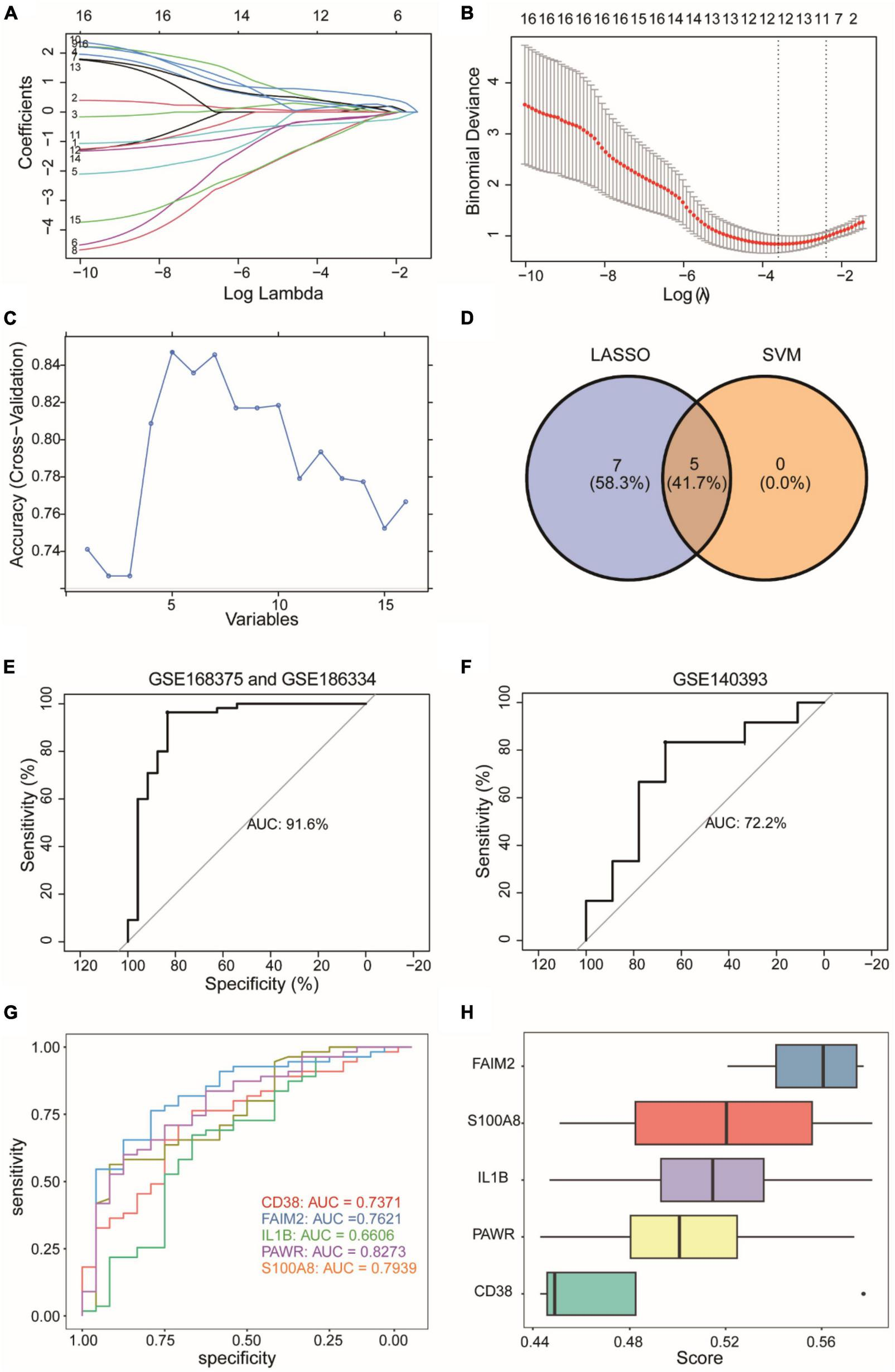 We employed the Lasso algorithm to select twelve feature genes from sixteen DEARGs (Figures 6A, B). Furthermore, we used the SVM-RFE algorithm to select five genes from the sixteen DEARGs (Figure 6C). Combining the results of both algorithms, we identified five feature genes (CD38, FAIM2, IL1B, PAWR, S100A8) as diagnostic biomarkers for epilepsy grouping (Figure 6D). Using logistic regression, a diagnostic model for epilepsy grouping was constructed with these five key genes. The risk score was calculated as: risk score = 0.596134*exp(CD38)–1.312078*exp(FAIM2) + 0.612583*exp(IL1B) + 1.568740*exp(PAWR)–0.687394*exp(S100A8). The constructed diagnostic model demonstrated high accuracy in diagnosing epilepsy, with an area under curve (AUC) value of 0.916 as shown in Figure 6E.