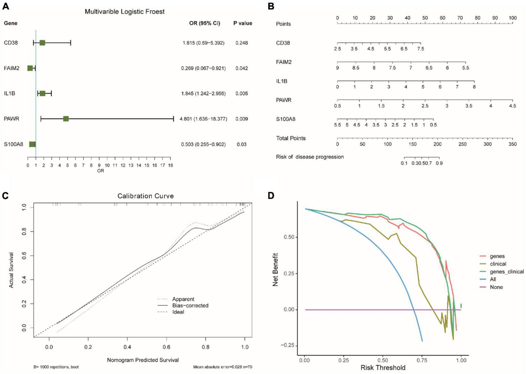 Evaluation of diagnostic models for integrated epilepsy datasets. (A) Impact analysis of genes on disease. OR: Odds Ratio. OR < 1 means that the gene is a protective factor, OR > 1 means that the gene is a risk factor. CI, confidence interval. (B) Nomogram analysis of diagnostic model. (C) Calibration curve for diagnostic model accuracy. (D) Decision curve for clinical effectiveness.