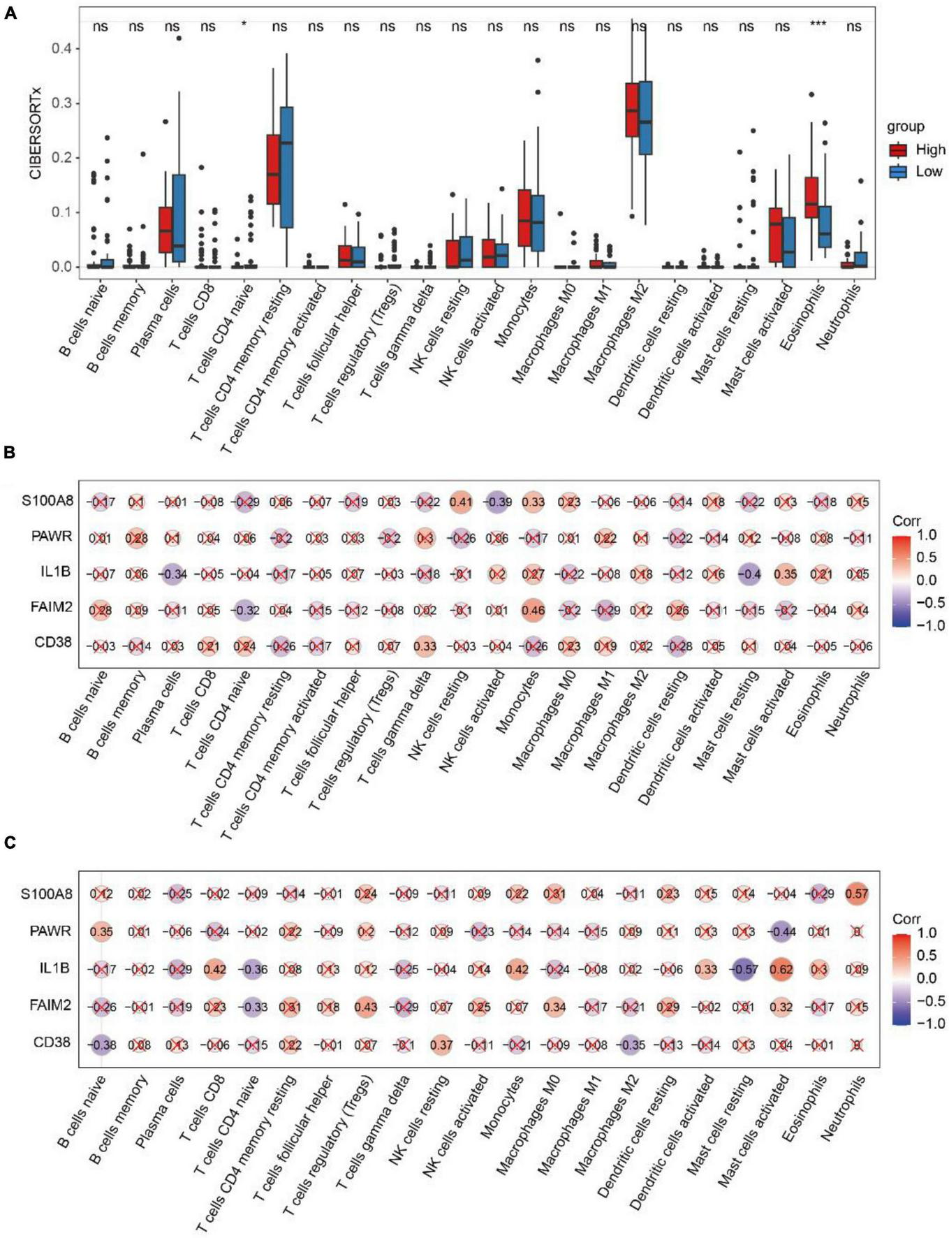 Analysis of CIBERSORTx immune infiltration. (A) The difference of immune cell infiltration with CIBERSORTx method in the high and low risk diagnosis group. * represents p-value < 0.05, ** represents p-value < 0.01, *** represents p-value < 0.001, **** represents p-value < 0.0001, ns represents not significant. (B) Spearman correlation between diagnostic genes and immune cell infiltration in the high-risk group. (C) Spearman correlation between diagnostic genes and immune cell infiltration in the low-risk group. Red marks indicate p-value > 0.05.