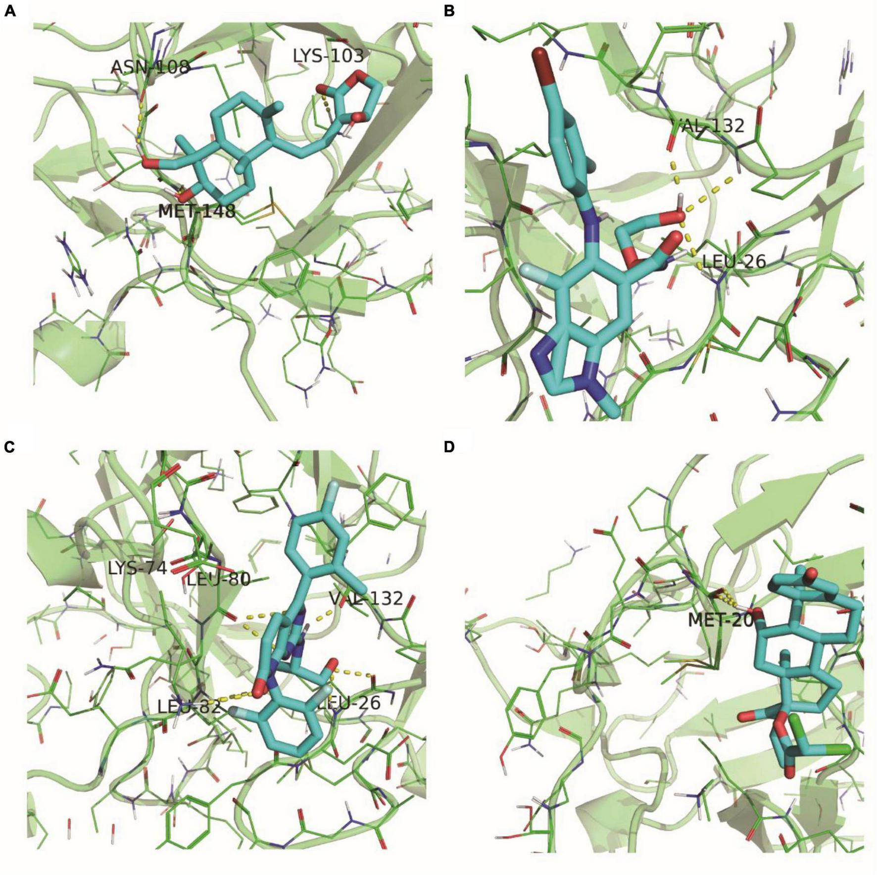 5R8Q configuration of IL1B and docking results of drug molecules. IL1B’s 5R8Q conformation with Andrographolide (A), Binimetinib (B), Dilmapimod (C) and Etiprednol Dicloacetate (D).