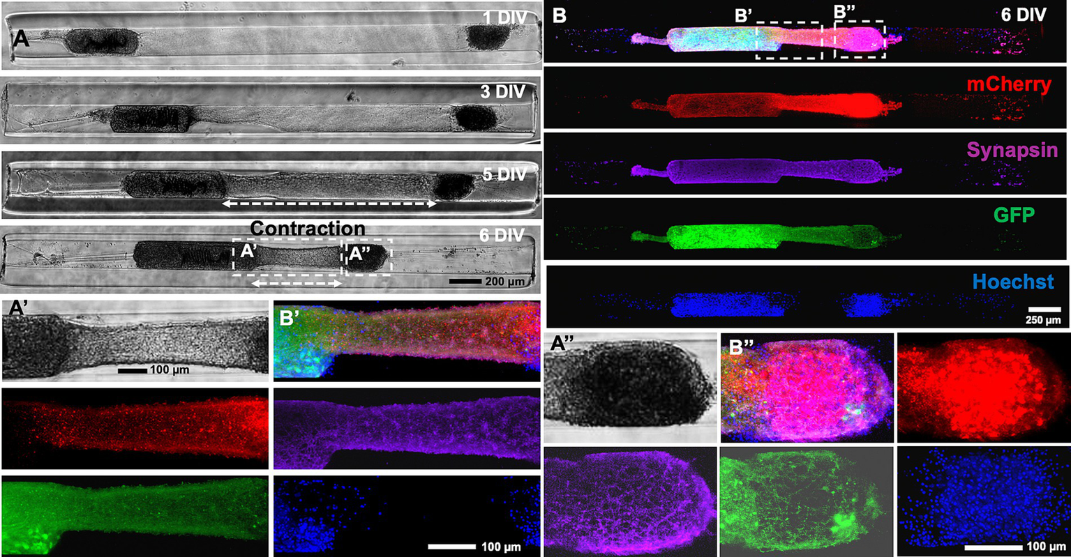 Putative synaptic integration in heterogenous cortical micro-TENNs. Micro-TENN cytoarchitecture was observed by immunolabelling the micro-TENNs at 6 DIV. (A) Representative phase contrast images of the construct at various time-points. (B) Confocal reconstruction of cortical micro-TENNs after immunocytochemistry (ICC). Cells in the micro-TENN transduced with AAV vectors expressed GFP and mCherry, which were further stained for presynaptic marker – synapsin-1 (far red) and nuclei (Hoechst; blue) to demonstrate the presence of pre-synaptic terminal protein Synapsin-I in the neural microtissue as the axons integrated and contracted. Zoom-in phase contrast images (A′,A″). The stained micro-TENN with zoom-in images show a labelled bundled axonal region (B′) and cell-aggregate region (B″) including individual channel images. Scale bars: A: 200 μm, B: 250 μm, A′,A″, B′,B″: 100 μm.