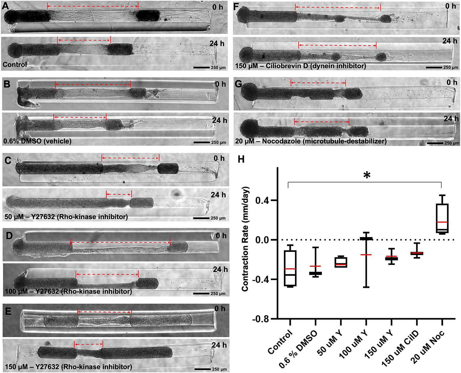 Mechanism of contraction in heterogenous cortical micro-TENNs. Drug effect on the contraction behavior of axon bundles in micro-TENNs. Phase contrast images of the micro-TENNs are shown before and 24 h post-treatment for various groups (n = 3 or 4): (A) Control (only media; n = 4), (B) Vehicle control with 0.6% DMSO in the media (n = 3), (C–E) Y27632 Rho-kinase inhibitor treatment at 50 μM (n = 4), 100 μM (n = 3), and 150 μM (n = 3) concentrations, (F) Ciliobrevin-D dynein inhibitor treatment at 150 μM concentration (n = 3), and (G) Nocodazole microtubule inhibitor at 20 μM concentration (n = 4). The dotted red lines highlight the length of the integrated axonal bundle between the two aggregates before and after drug administration. (H) The contraction rates from the various treatment groups were calculated after the 24 h treatment relative to the previous time-point, and are represented using a box and whisker plot. The study demonstrates various effects of the treatments in attenuating the rate of axonal contraction, showing significant suspension by nocodazole (p < 0.05) in comparison to the control. The box plot represents median (black horizontal line inside the box), mean (red lines), interquartile range (box) between first and third quartiles, and whiskers (error bars = min/max values). Statistical analysis was performed by transforming the data with formula [1/(Y + 1)] as represented by Supplementary Figure S6 and applying one-way ANOVA. Scale bars: A–G: 250 μm.