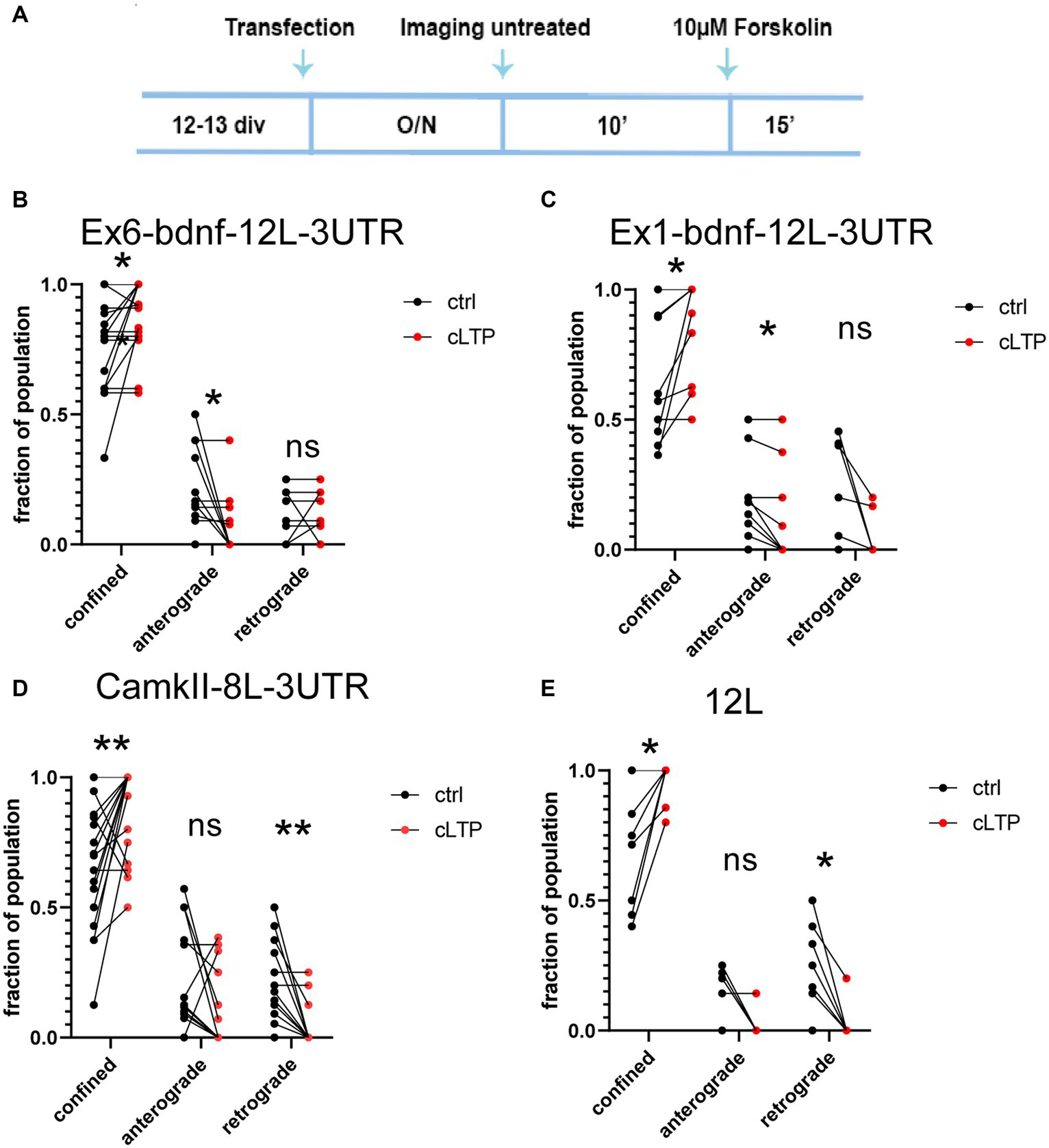 Dynamics of mRNA granules after cLTP induction. (A) Experimental outline: after an overnight (O/N = 17-18 h) from transfection, neurons were imaged for 10′ in a control medium (untreated), and then, the same neurons were incubated with 10 μM Forskolin and imaged for an additional 15 min. (B) After cLTP, Ex6-bdnf-12 L-3UTR granules showed an increased fraction of confined granules (p = 0.0234) and a decrease in the fraction of anterograde granules (p = 0.0156). (C) After cLTP, Ex1-bdnf-12 L-3UTR showed an increase in the confined granule population (p = 0.0156) and a decrease in the anterograde granules (p = 0.0313). (D) CamkIIα-8 L-3UTR showed an increase in the confined granules (p = 0.0084) and a decrease in the retrograde granules (p = 0.0020). (E) 12 L showed an increase in the confined granule population (p = 0.0313) and a decrease in the retrograde granules (p = 0.12). Statistical analysis was performed by paired t-test.