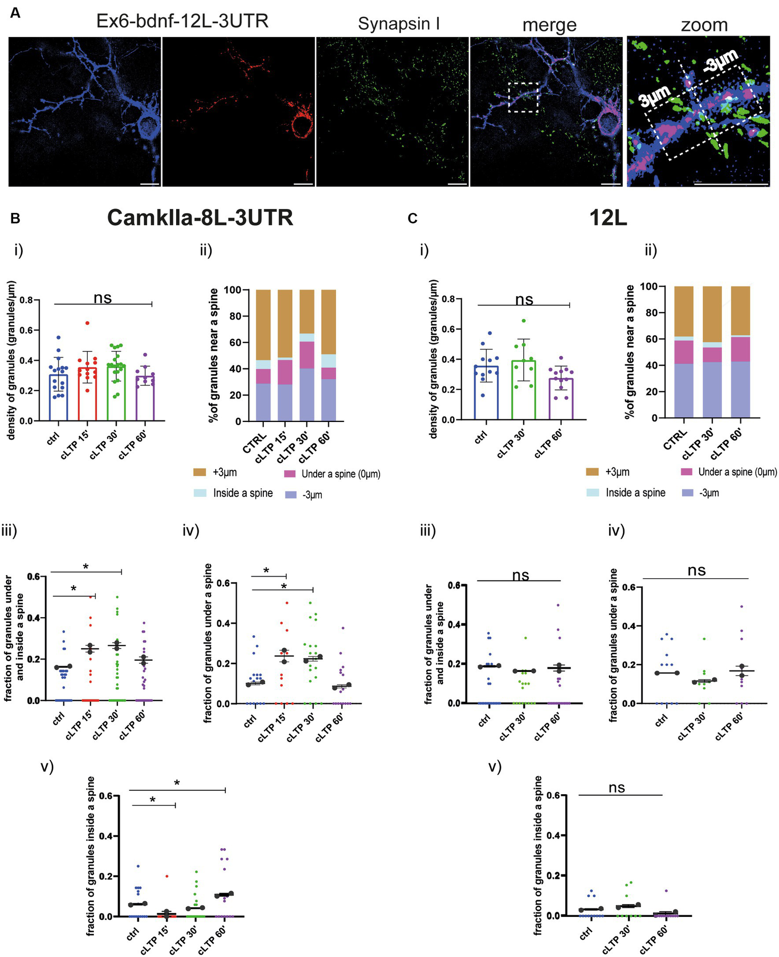 CamkIIα mRNA and 12 L RNA granules dynamics in proximity to dendritic spines. (A) Representative thresholded images of Ex6-BDNF-12 L-3UTR and Synapsin I. From the high magnification section, a spine is visible, and granules found in the range of +3 μm and − 3 μm were considered. Scale bar 5 μm. (B) CamkIIα-8 L-3UTR granules. (i) CamkIIα mRNA granules counted in each dendrite stretch of 30–50 μm. ANOVA followed by Dunnett’s post-hoc test revealed no significant difference in the density of mRNA CamkIIα granules after cLTP stimulation. (ii) mRNA granule distribution near a spine after cLTP induction. Granules under a spine and inside a spine were considered. (iii) CamkIIα granules under and inside a spine were considered at different cLTP induction. After 15 min and 30 min from cLTP induction, there is an increase in the granules present under and inside a spine (ctrl vs. cLTP 15′ p = 0.0311, ctrl vs. cLTP 30′ p = 0.0180). (iv) CamkIIα granules under a spine were significantly higher after 15 min and 30 min from cLTP induction (p = ctrl vs. cLTP 15′ p = 0.0140 and ctrl vs. cLTP 30′ p = 0.0204). (v) CamkIIα granules inside a spine were significantly higher after 60 min from cLTP ctrl vs. 15′ p = 0.03369 and ctrl vs. cLTP 60′ p = 0.00336. (C) 12 L RNA granules. (i) 12 L RNA granules counted in each dendrite stretch of 30–50 μm ANOVA followed by Dunnett’s post-hoc test revealed no significant difference in the density of 12 L granules after cLTP stimulation. (ii) RNA granule distribution near a spine after cLTP induction. (iii) 12 L RNA granules under and inside a spine were considered at different cLTP induction. (iv) 12 L RNA granules under a spine were not significantly higher after cLTP induction. (v) 12 L RNA granules inside a spine were not significantly higher after cLTP.