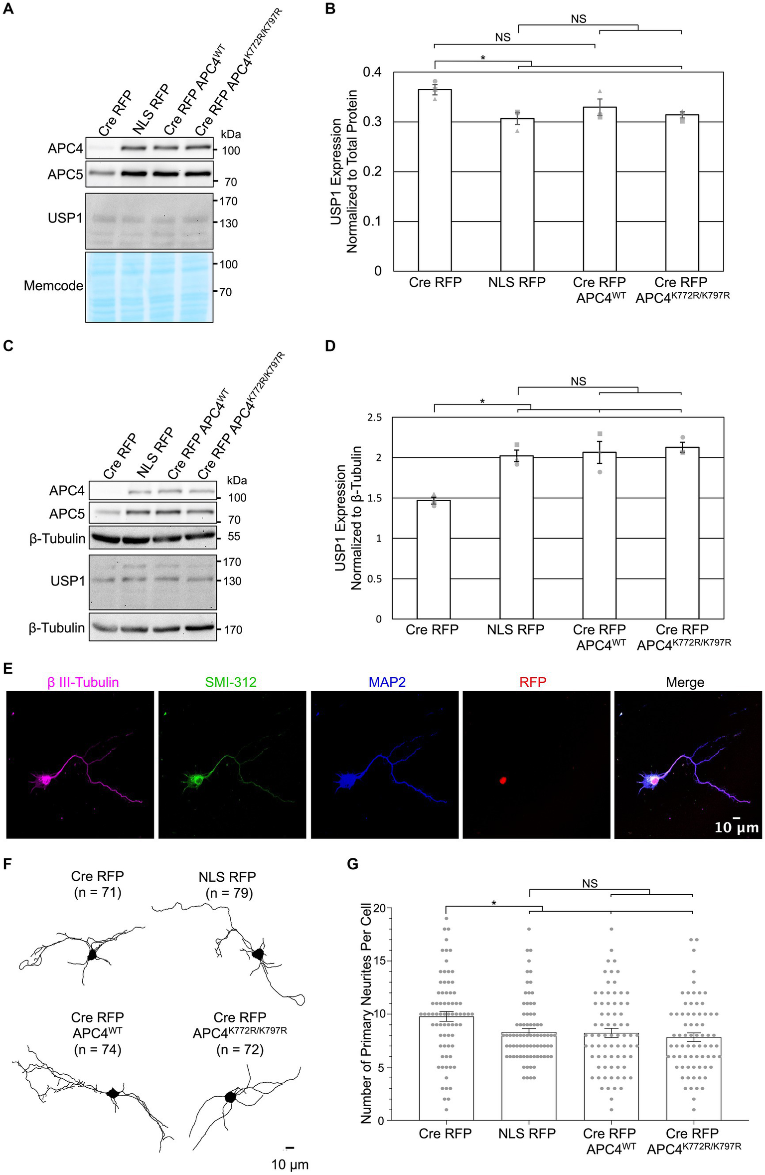We next examined if APC4 SUMOylation is involved in APC/C-dependent regulation of USP1 levels and the number of neurites exiting somata. We previously observed increased USP1 protein levels in DIV5 KO neurons (Figures 2D,E) and decreased USP1 protein levels in DIV11 KO neurons (Figures 3B,C). We repeated this analysis with cortical ANAPC4 KO neurons infected with lentiviruses expressing Cre RFP, NLS RFP, or rescue viruses expressing Cre RFP APC4WT (wildtype) or Cre RFP APC4K772R/K797R (SUMOylation-deficient). The levels of APC4 and APC5 were fully rescued in Cre RFP APC4WT-and Cre RFP APC4K772R/K797R-infected cultures, indicating that APC/C integrity was rescued (Figures 5A–D). Consistent with our prior experiments, we saw increased USP1 levels at DIV5 (Figures 5A,B) and decreased levels at DIV 11 (Figures 5C,D) in KO cultures. These changes in USP1 levels were rescued in Cre RFP APC4WT-and Cre RFP APC4K772R/K797R-infected cultures (Figures 5A–D), indicating that USP1 is indeed regulated, directly or indirectly, by the APC/C, albeit independently of APC4 SUMOylation. In a final set of experiments, we tested if APC4 SUMOylation affects the ability of the APC/C to regulate the number of primary neurites exiting somata (Figure 4F). We imaged DIV5 cortical neurons and analyzed primary neurite numbers using β III-Tubulin immunolabeling (Figures 5E–G). Similar to what we had observed previously, ANAPC4 KO caused an increase in the number of neurites exiting somata (Figure 5G), and this KO phenotype was fully rescued in Cre RFP APC4WT-and Cre RFP APC4K772R/K797R-infected cultures (Figure 5G). This indicates that the APC/C does indeed regulate the number of primary neurites exiting somata, albeit in a manner that does not require APC4 SUMOylation.
