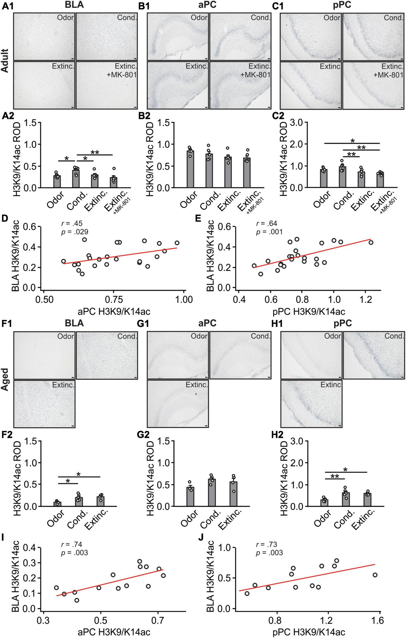 H3K9/K18 activations in the BLA and PC were strongly correlated. (A1) Example images of H3K9/K18ac expression in the BLA of adult rats. (A2) H3K9/K18ac ROD in the BLA. (B1) Example images of H3K9/K18ac expression in the aPC of adult rats. (B2) H3K9/K18ac ROD in the aPC. (C1) Example images of H3K9/K18ac expression in the pPC of adult rats. (C2) H3K9/K18ac ROD in the pPC. (D) The correlation between BLA and aPC H3K9/K18ac in adult rats. (E) The correlation between BLA and pPC H3K9/K18ac in adult rats. (F1) Example images of H3K9/K18ac expression in the BLA of aged rats. (F2) H3K9/K18ac ROD in the BLA. (G1) Example images of H3K9/K18ac expression in the aPC of aged rats. (G2) H3K9/K18ac ROD in the aPC. (H1) Example images of H3K9/K18ac expression in the pPC of aged rats. (H2) H3K9/K18ac ROD in the pPC. (I) The correlation between BLA and aPC H3K9/K18ac in aged rats. (J) The correlation between BLA and pPC H3K9/K18ac in aged rats. Scale bars, 50 μm. *p < 0.05; **p < 0.01.