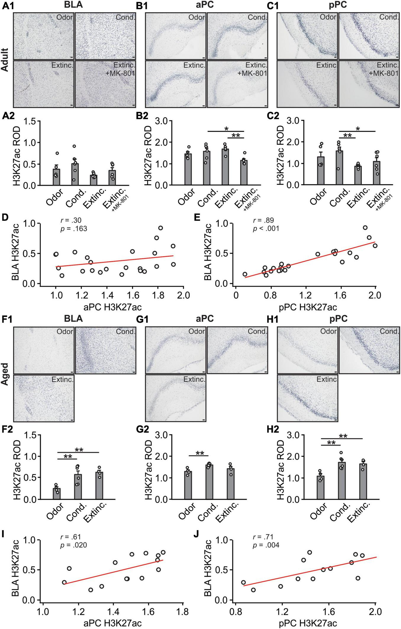 H3K27 activations in the BLA and pPC were strongly correlated. (A1) Example images of H3K27ac expression in the BLA of adult rats. (A2) H3K27ac ROD in the BLA. (B1) Example images of H3K27ac expression in the aPC of adult rats. (B2) H3K27ac ROD in the aPC. (C1) Example images of H3K27ac expression in the pPC of adult rats. (C2) H3K27ac ROD in the pPC. (D) The correlation between BLA and aPC H3K27ac in adult rats. (E) The correlation between BLA and pPC H3K27ac in adult rats. (F1) Example images of H3K27ac expression in the BLA of aged rats. (F2) H3K27ac ROD in the BLA. (G1) Example images of H3K27ac expression in the aPC of aged rats. (G2) H3K27ac ROD in the aPC. (H1) Example images of H3K27ac expression in the pPC of aged rats. (H2) H3K27ac ROD in the pPC. (I) The correlation between BLA and aPC H3K27ac in aged rats. (J) The correlation between BLA and pPC H3K27ac in aged rats. Scale bars, 50 μm. *p < 0.05; **p < 0.01.