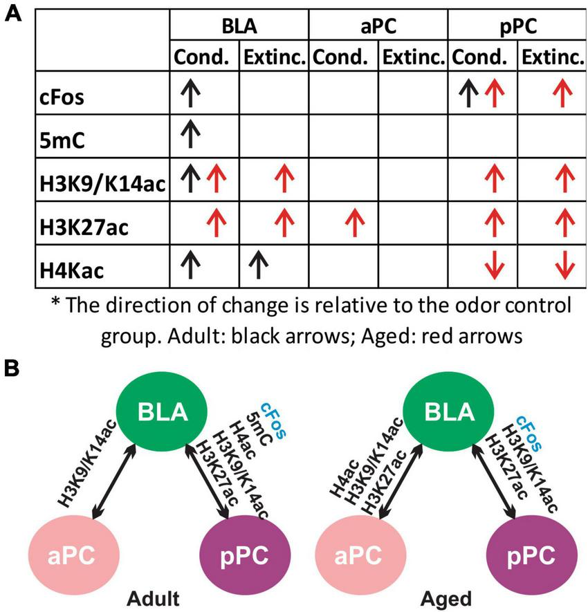 Summary of cFos and epigenetic expression in olfactory threat conditioning and extinction learning. (A) Changes of cFos and epigenetic markers in the conditioned and extinction-trained groups compared to the odor only group (post hoc Tukey followed by one-way ANOVA). (B) cFos and epigenetic mark correlations between the BLA, aPC and pPC in adult and aged rats.