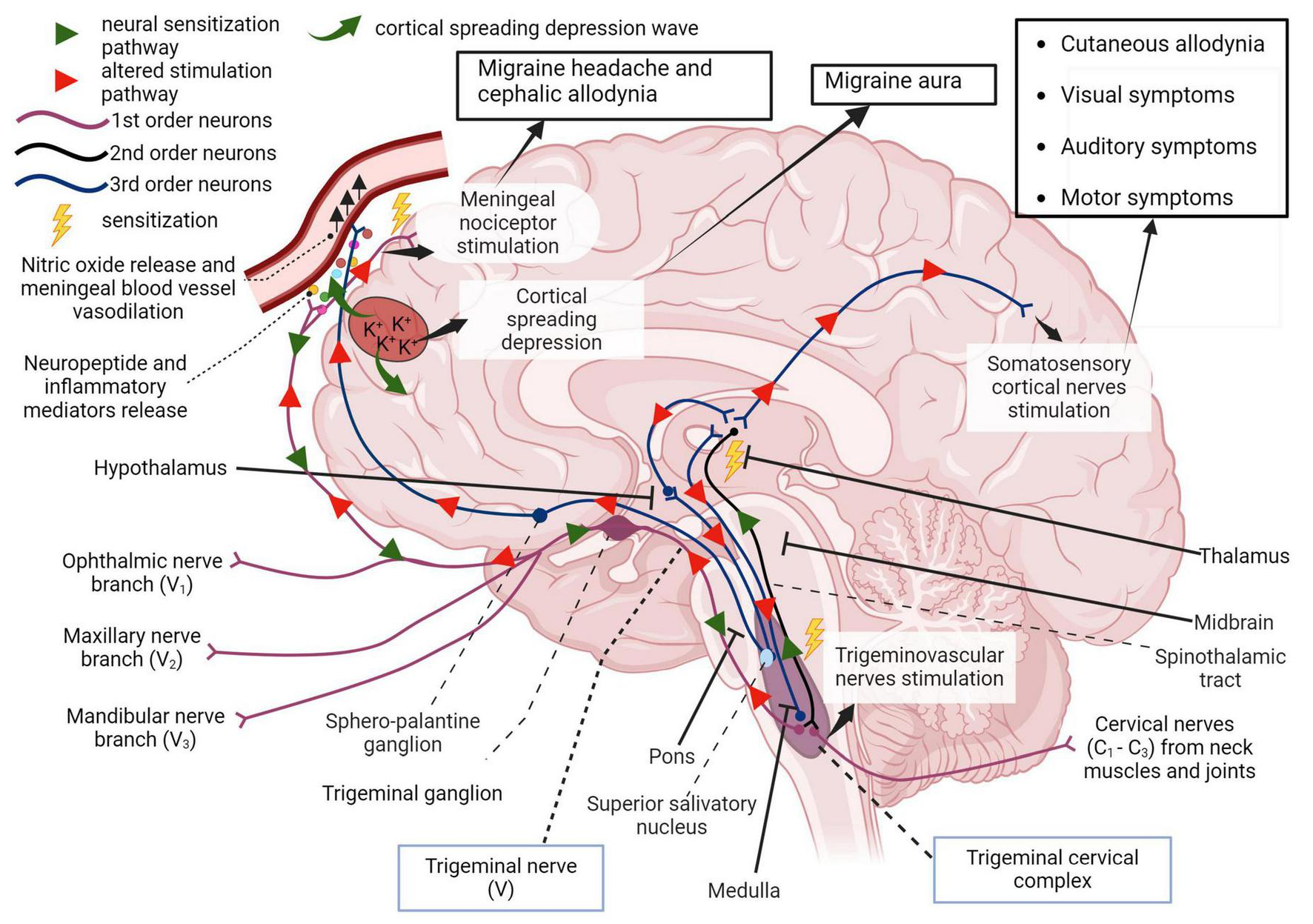 First order afferent nerves of the trigeminal nerve (cranial nerve V) transmit sensory information from the orofacial region and meninges for signal processing in the thalamus. In migraine, peripheral sensitization may occur when neuroinflammatory peptides such as CGRP, as well as processes that lead to mast cell degranulation, cause the downstream sensitization of nerves in the trigeminal pathway. In addition, cortical spreading depression which involves an increase in extracellular potassium ions and enhanced glutamatergic signaling can also trigger this neurogenic response and is also responsible for the symptoms associated with migraine aura. Localized meningeal nociceptor sensitization is another outcome of these processes. The altered afferent signaling pathway sensitizes second order nerves in the trigeminal cervical complex via the trigeminal ganglion and impulses reach the thalamus via the spinothalamic tract. Third order neural projections from the thalamus that innervate the somatosensory cortex, hypothalamus and other areas of the brain undergo an aberrant stimulatory process that causes somatic symptoms of migraine such as extracephalic (cutaneous) allodynia, auditory, visual, and motor impairment. Descending pathways from the thalamus also sensitize the hypothalamus to cause a parasympathetic outflow through the superior salivatory nucleus that promotes nitric oxide release and vasodilation in meningeal blood vessels. The trigeminal nerve endings also secrete neuropeptides that sensitize meningeal nociceptors to cause headache and/or cephalic allodynia (Goadsby et al., 2017; Ashina et al., 2019; Mungoven et al., 2021, 4). Adapted from BioRender (2024).