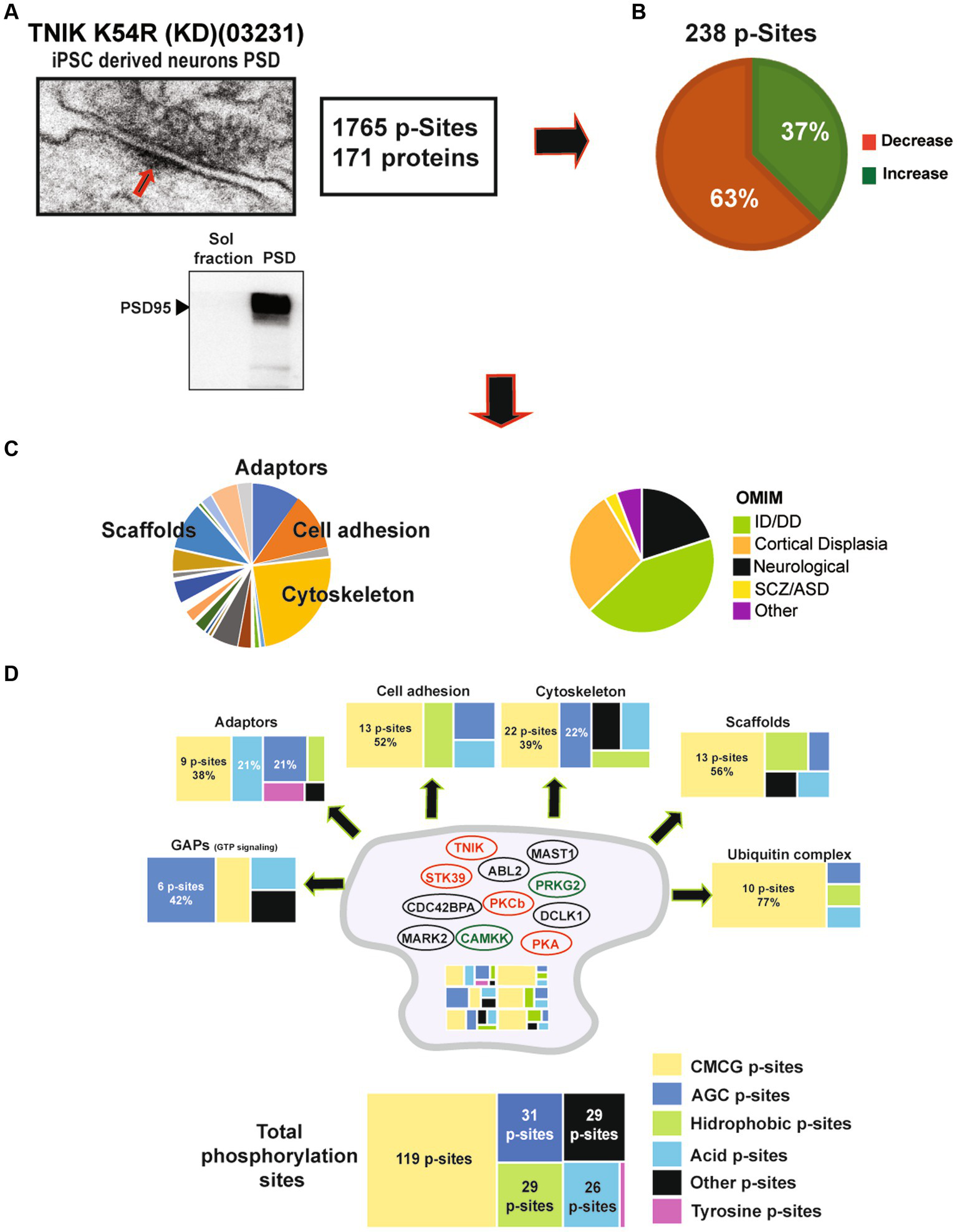 (A) Representative electron microscope picture of a synapse including the PSD region from iPSC-derived excitatory neurons. Lower panel: representative WB showing enrichment of the PSD marker PSD95 in PSD fractions when compared to soluble fractions from 21DIV iN. (B) Analysis of the phosphoproteome of TNIK K54R (KD; 03231) PSDs. Figure shows a higher percentage of dephosphorylated proteins at the PSD (63%). (C) Left pie chart shows protein function categories dysregulated by lack of TNIK protein kinase activity. Chart highlights the top four functional categories: cytoskeletal, adaptors, scaffold, and cell adhesion proteins. Right pie chart shows dysregulated proteins corresponding to genes included in Online Mendelian Inheritance in Man (OMIM) catalog with Mendelian mutations. Chart shows increased numbers of intellectual disability (ID), developmental delay (DD), and cortical dysplasia mutations in components of the PSD from TNIK K54R (KD; 03231) neurons. (D) Distribution of protein kinase families predicted to phosphorylate the total number of proteins (bottom) and each functional category (individual panels). Color code shows a large dysregulation of CMCG family of protein kinases across different functional categories together with individual patterns for each functional category. Panels show number of dysregulated phosphorylation sites and individual percentages for most abundant categories. Cartoon of the postsynaptic site shows protein kinases dysregulated in TNIK K54R (KD; 03231) PSDs. Color code shows in red protein kinases with decreased activity and in green protein kinases with increased activity. Protein kinases with dysregulated phosphorylation sites of unknown function are shown in black.